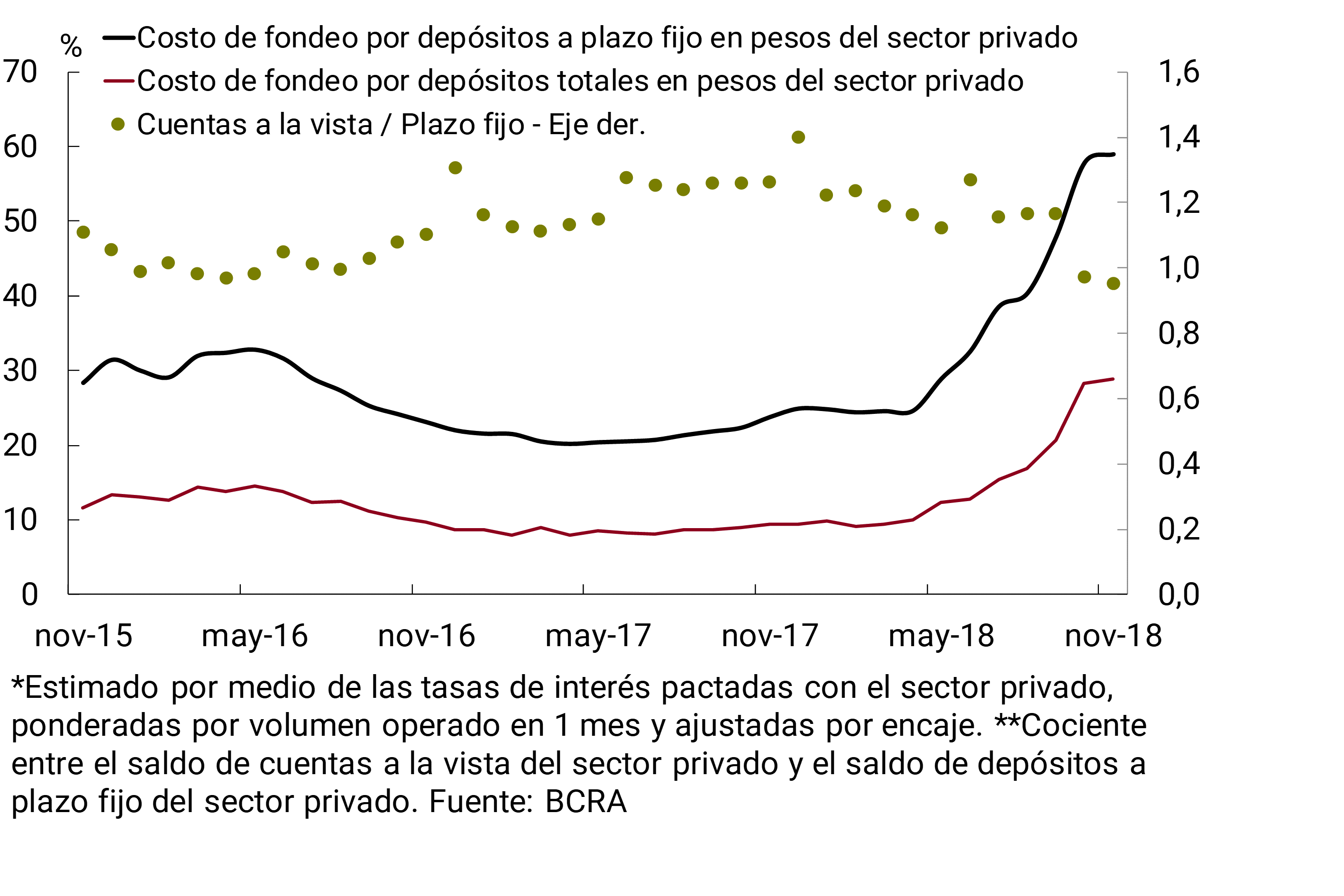 Las tasas de interés que los bancos operaron con el sector privado por depósitos a plazo fijo en pesos aumentaron levemente en noviembre (+0,9 p.p. hasta ubicarse en 47,7% nominal anual en promedio), tendiendo a estabilizarse en el margen, luego de varios meses de trayectoria creciente. Este desempeño estuvo en línea con la dinámica de la tasa de interés de referencia, que desde mediados de octubre continúa mostrando un descenso. Este contexto, sumado a un leve incremento de la ponderación de los depósitos a plazo en el total, dio lugar a que el costo de fondeo estimado por depósitos del sector privado en pesos se incremente ligeramente en noviembre (ver Gráfico 8).