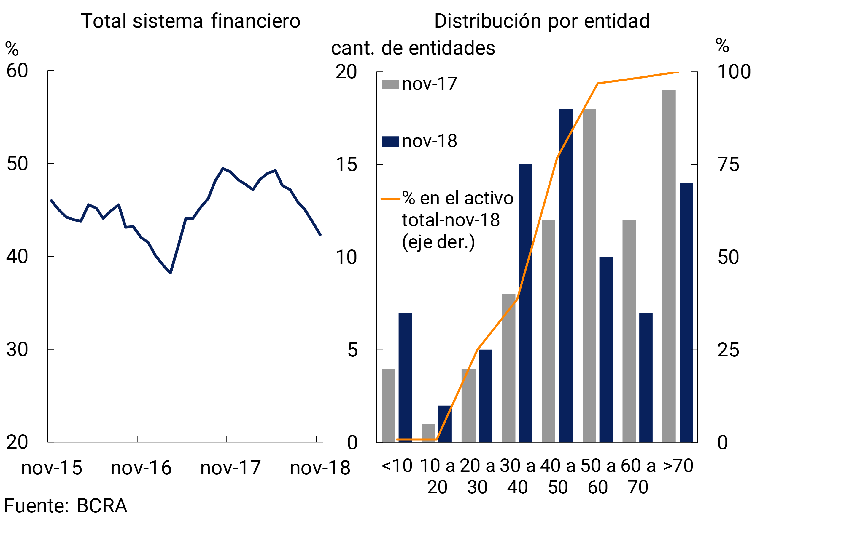 • La rentabilidad nominal del sistema financiero se ubicó en torno a 2,4%a. del activo en noviembre (1,1 p.p. inferior al registro del mes pasado), alcanzando 4%a. en los bancos privados (1 p.p. por debajo del mes anterior). El ROE mensual totalizó 22,9%a. del patrimonio neto del conjunto de bancos (9,1 p.p. menos que en octubre), siendo 36,6%a. en las entidades privadas (-8,1 p.p. de variación mensual). La rentabilidad que el sistema financiero acumuló en los primeros once meses de 2018 se ubicó en torno a 3,8%a. del activo (0,8 p.p. más que en el mismo período de 2017) y a 34,1%a. del patrimonio neto (creciendo 8,3 p.p. en términos interanuales).