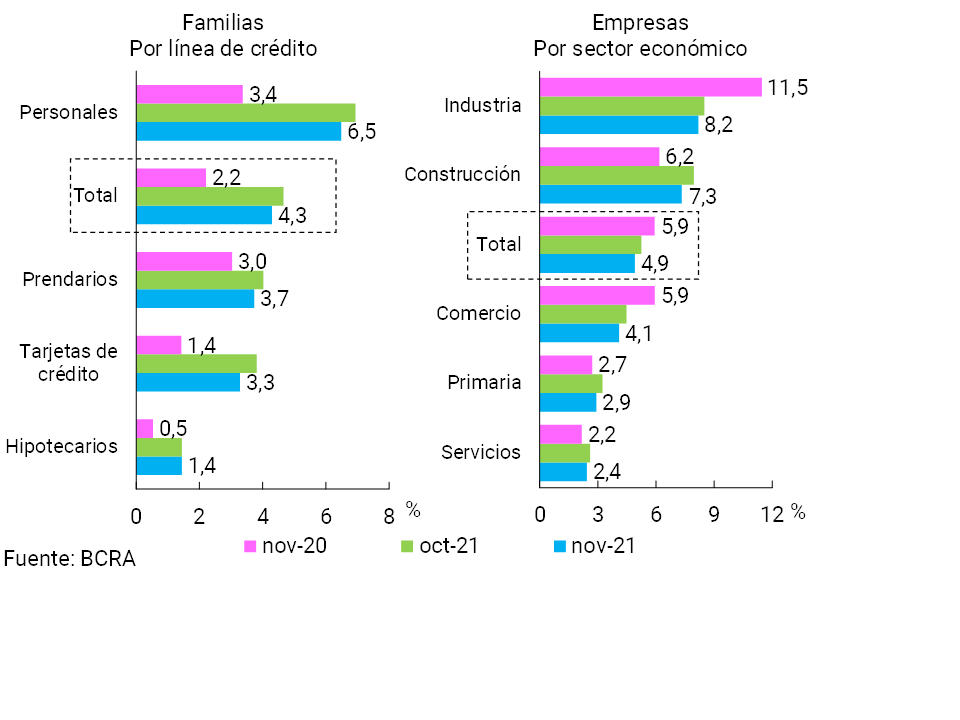 Por el lado del segmento en moneda extranjera, en noviembre el saldo de crédito al sector privado en esta denominación se redujo 13,6% respecto a octubre —en moneda de origen—, con una caída generalizada en todos los grupos de entidades financieras. En este marco, el saldo de crédito total (incluyendo moneda nacional y extranjera) al sector privado se incrementó 2,7% real en el mes (5,2% nominal), disminuyendo 6,2% real en términos interanuales.