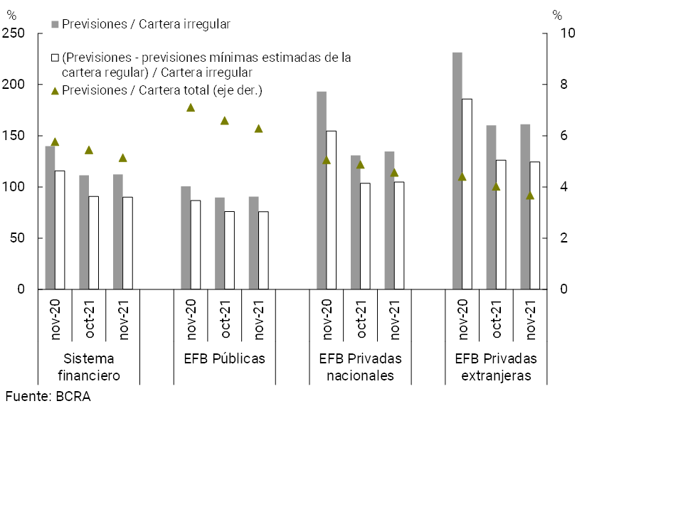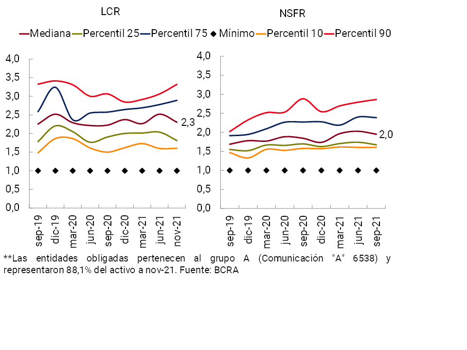 • La liquidez en sentido amplio del sistema financiero totalizó 68,5% de los depósitos totales en noviembre, 0,8 p.p. menos con respecto al registro del mes anterior (+4,3 p.p. i.a.). Respecto a los ratios de liquidez definidos por el Comité de Basilea (“LCR” y “NSFR”), el conjunto de entidades obligadas (Grupo A) continuó superando holgadamente los niveles mínimos exigidos a nivel local y recomendados internacionalmente.