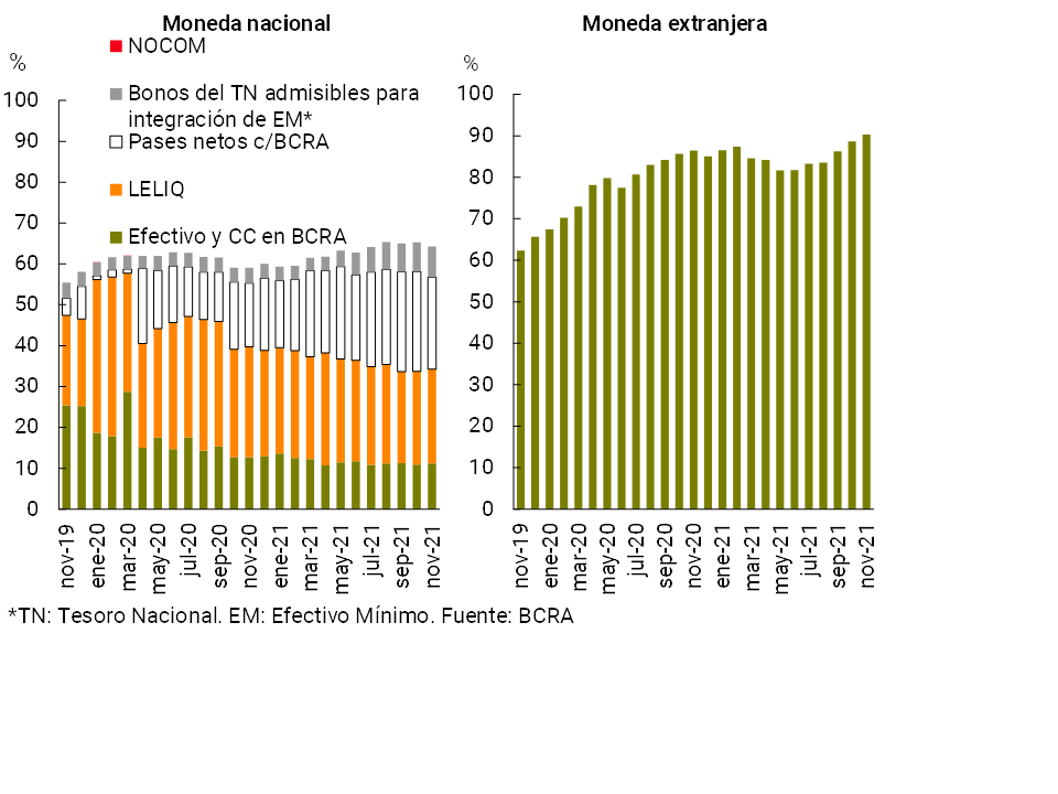 14Con respecto a los cambios normativos con potenciales efectos en la liquidez, cabe destacar que con el fin de reordenar el esquema de tasas de interés y simplificar la organización de la liquidez sistémica, el BCRA recientemente rediseñó los instrumentos de política monetaria. Se estableció, en primer lugar, un aumento de 2 puntos porcentuales de la tasa de interés nominal de la LELIQ a 28 días de plazo. Se decidió también expandir el límite máximo de tenencia de estas Letras por hasta un monto proporcional al stock de depósitos a plazo del sector privado de cada entidad financiera. Al mismo tiempo, la autoridad monetaria avanzó en la creación de una nueva LELIQ a 180 días de plazo. En cuanto a los instrumentos de menor plazo, se eliminan progresivamente los pases pasivos a 7 días continuando en vigencia los concertados a 1 día. Para mayor detalle, ver “Nota de prensa del 6 de enero de 2022”.