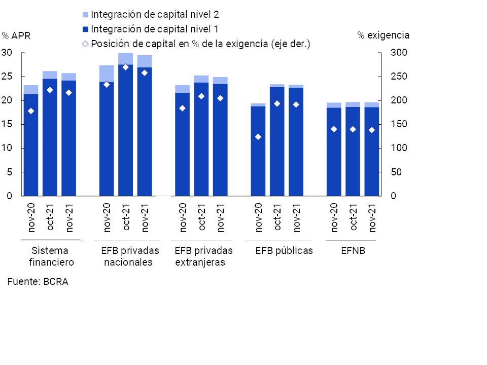 Los indicadores de solvencia continuaron siendo elevados en noviembre, en un nivel levemente por debajo de los de octubre. La integración de capital (RPC) disminuyó 0,5 p.p. de los activos ponderados por riesgo (APR) para el agregado del sector, hasta ubicarse en 25,7% (+2,5 p.p. i.a., ver Gráfico 15), en un contexto en que el crédito creció significativamente respecto al mes previo. Cabe recordar que más del 94% del capital regulatorio está compuesto por el Capital de Nivel 1, con mayor capacidad para afrontar potenciales pérdidas. A su vez, la posición excedente de capital (diferencia entre RPC y el requisito normativo mínimo de capital) totalizó 216% de la exigencia regulatoria para el conjunto de entidades en el mes, 5,7 p.p. menos que en octubre (+38,5 p.p. i.a.).