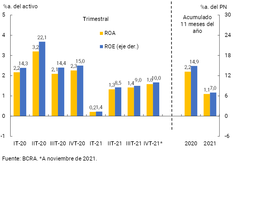 En relación con los indicadores de rentabilidad, en noviembre el sector devengó un resultado total integral positivo en moneda homogénea, acumulando así en los 11 meses de 2021 utilidades equivalentes a 1,1% anualizado (a.) del activo (ROA) y a 7%a. del patrimonio neto (ROE) (ver Gráfico 16). Estos niveles resultaron inferiores a los evidenciados en el mismo período de 2020 (-1,1 p.p. y -7,9 p.p. en términos del activo y patrimonio neto, respectivamente).