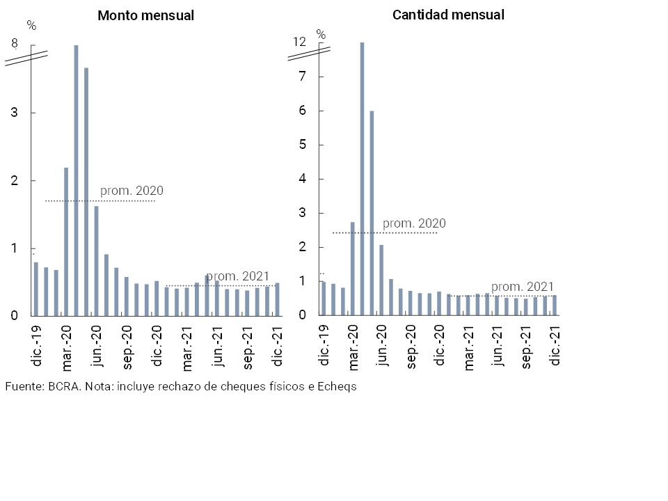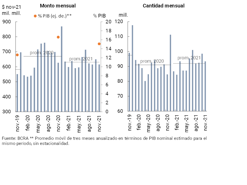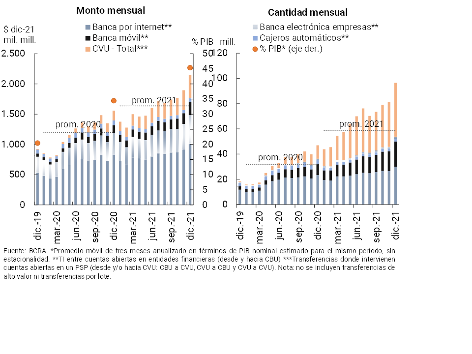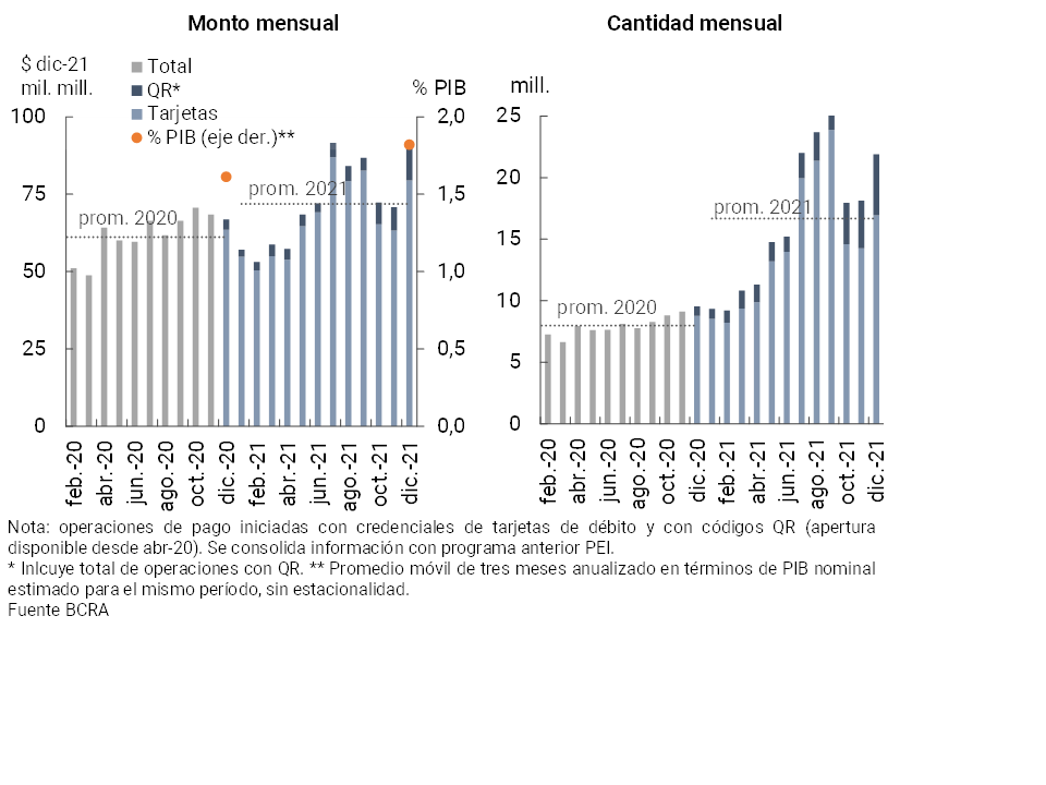 • Las operaciones de pago por canales electrónicos tuvieron un positivo desempeño a lo largo de 2021. El monto de transferencias inmediatas acumuló un crecimiento de 37,7% i.a. real (105,5% i.a. en cantidad) a diciembre. Entre puntas de año el valor compensado mensual mediante cheques electrónicos (ECHEQs) se incrementó 111% real (134 % en cantidad), aumentando su relevancia en el total de cheques compensados hasta totalizar 47,3 % y 22,9 % del valor y la cantidad total en diciembre, respectivamente. Por su parte, las transacciones interoperables iniciadas a través de QR en el marco del esquema de Transferencias 3.0, están permitiendo un sostenido crecimiento en el uso de los pagos digitales por parte de las personas usuarias. Así, desde fines de noviembre pasado y hasta mediados de enero (última información disponible) las transacciones interoperables con códigos QR acumularon 2,01 millones, siendo realizadas por un total de $3.509 millones.