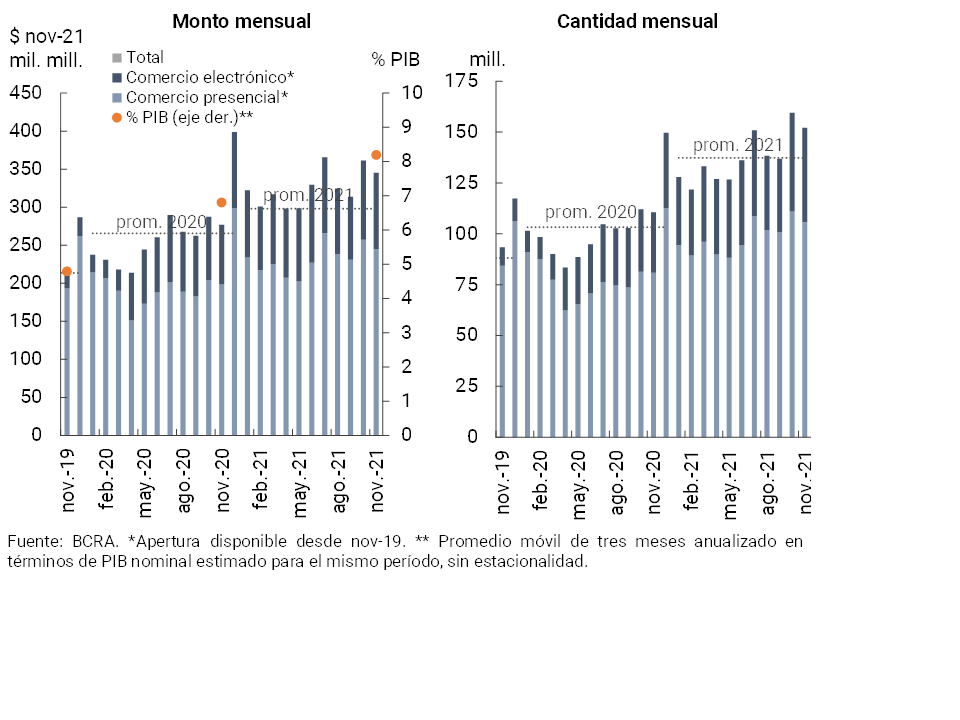 En parte asociado a motivos estacionales, las operaciones con tarjetas de débito -presenciales y electrónicas- disminuyeron en noviembre22 respecto a octubre (última información disponible): -4,6% en cantidades y -4,5% real en montos (ver Gráfico 19). No obstante el desempeño mensual, en términos interanuales estas operaciones se expandieron significativamente (+37,5% en cantidades y +24,6% en términos reales), evidenciando mayor dinamismo en aquellas cursadas de forma digital. De esta manera, las transacciones electrónicas siguieron incrementando su participación relativa, alcanzando a representar en el mes 30,6% en cantidad de operaciones y el 29,1% en montos. Se estima que a noviembre el volumen total de operaciones mediante tarjeta de débito representó un 8,2% del PIB (1,4 p.p. más que en igual mes del año anterior).