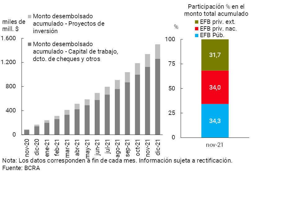 A través de la línea de financiamiento a tasas de interés subsidiadas para empresas inscriptas en el “Programa de Asistencia de Emergencia al Trabajo y la Producción” (ATP)6, se llevan otorgados más de 20.900 créditos totalizando desembolsos cercanos a $14.200 millones sobre el cierre de 2021.