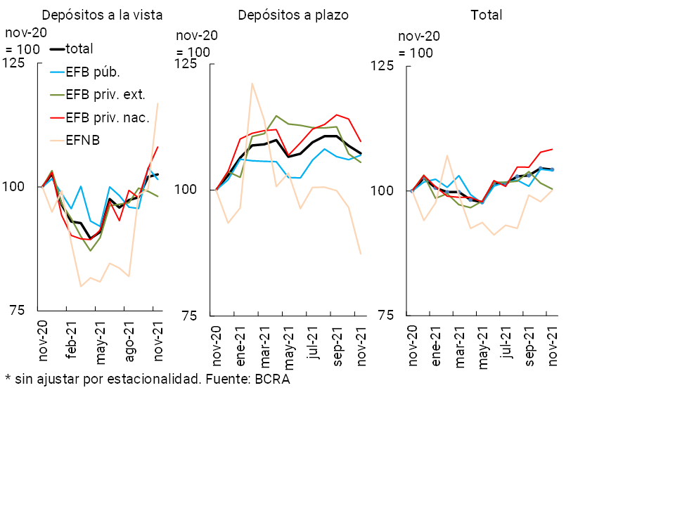Por su parte, el saldo de depósitos en moneda extranjera del sector privado se redujo 4,7% —en moneda de origen— en noviembre. Así, los depósitos totales del sector privado (en moneda nacional y extranjera) disminuyeron 1,3% real con respecto al mes anterior (+1,2% nominal).