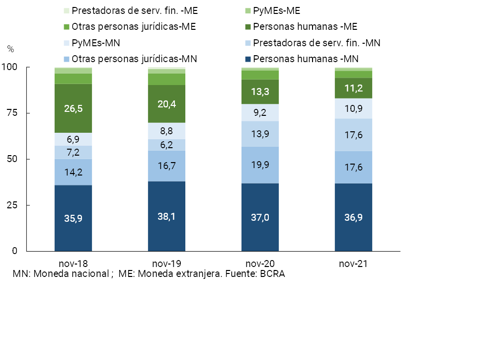 Al desagregar los depósitos del sector privado según moneda y tipo de cliente, en los últimos cuatro años se observa un incremento de la relevancia de aquellos en moneda nacional (ver Gráfico 5). En particular, los depósitos en pesos de los prestadores de servicios financieros mostraron el mayor incremento relativo durante este lapso (hasta totalizar 17,6%)9. En contraposición, los depósitos en moneda extranjera fueron perdiendo importancia en el total, desempeño impulsado principalmente por las menores colocaciones de las personas humanas en dicha denominación (hasta alcanzar 11,2%). Por su parte, sin evidenciar grandes modificaciones en los últimos años, los depósitos en moneda nacional provenientes de las personas humanas continúan concentrando la mayor parte de los depósitos del sector privado (hasta abarcar 36,9%).