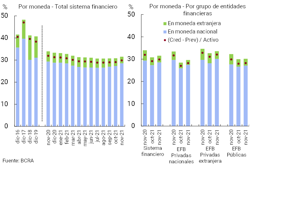 En este contexto, el cociente entre la posición excedente de capital regulatorio y el crédito al sector privado neto de previsiones16 se ubicó en 31,7% a nivel sistémico en noviembre, 1 p.p. por debajo del registro del mes pasado y 5,8 p.p. superior al de noviembre de 2020. A nivel agregado, el valor actual de este indicador se encuentra muy por encima del promedio de los últimos 10 años —14,5%—.