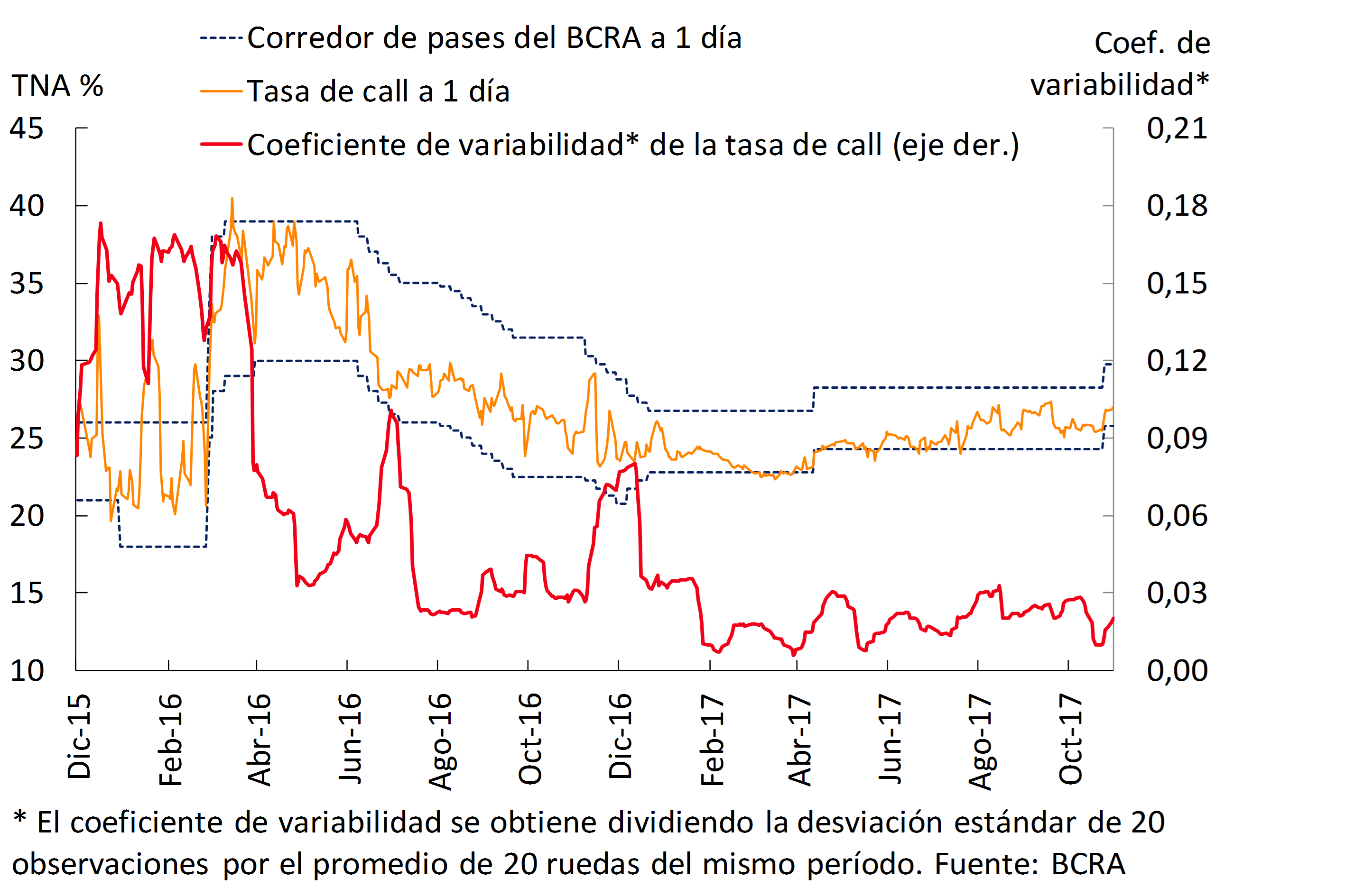 En octubre las tasas de interés del mercado de call se mantuvieron dentro del corredor de pases del BCRA, adecuándose al incremento dispuesto para las operaciones de pases con esta Institución. En el mes la tasa de política monetaria —centro del corredor de pases de 7 días— se incrementó 1,5 p.p., hasta 27,75%. Este corredor alcanzó 27%-28,5% en octubre. Posteriormente, en el comienzo de noviembre el BCRA decidió otro aumento de 1 p.p. de su tasa de política monetaria, hasta ubicar el centro del corredor en 28,75%. En este contexto, las tasas de interés de los mercados interfinancieros de liquidez siguieron evidenciando una moderada volatilidad en octubre (ver Gráfico 10).