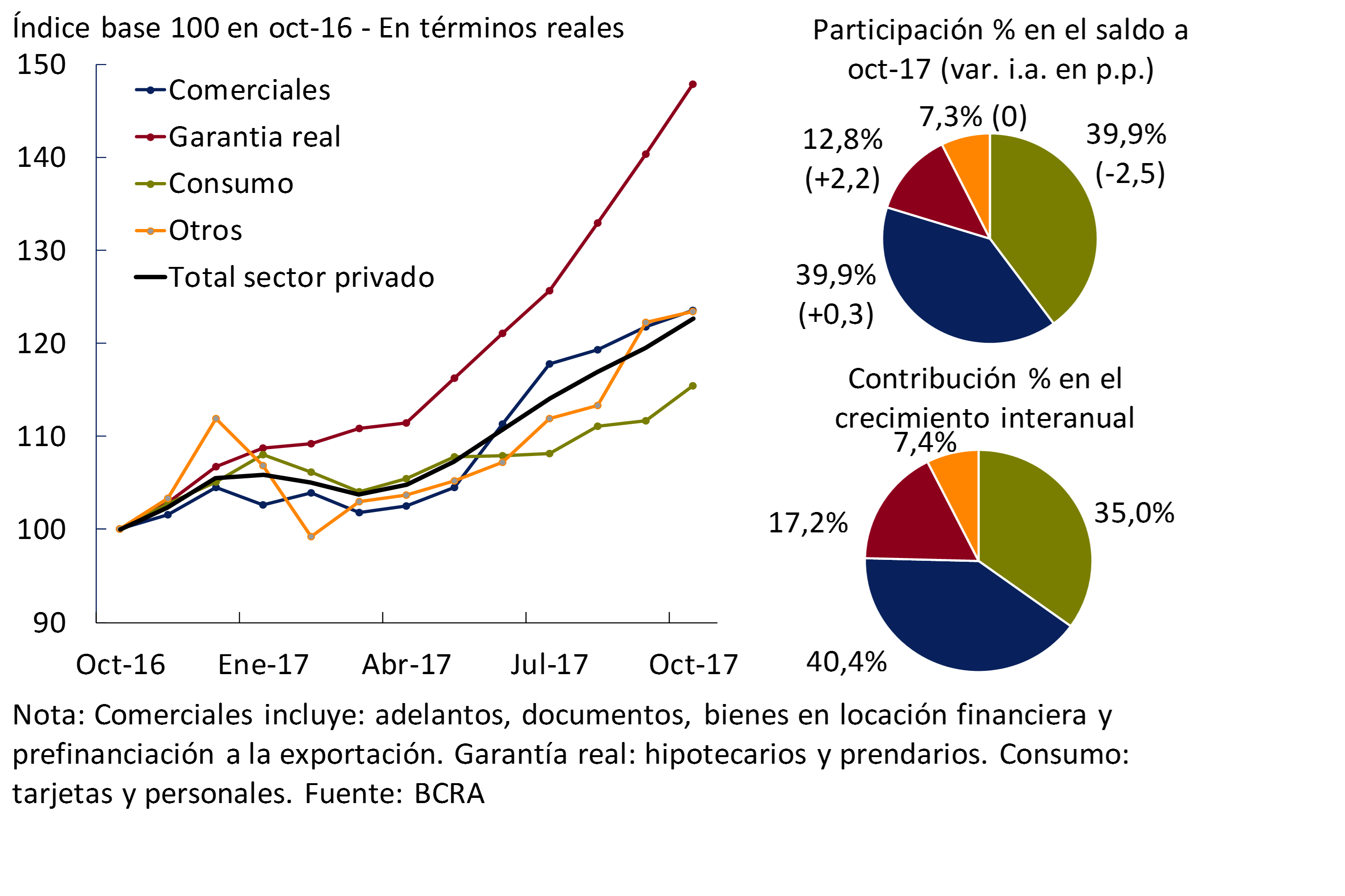 • El saldo de financiamiento total al sector privado creció 2,6% en términos reales en octubre, aumento explicado mayormente por las líneas en pesos (3,1% real). En una comparación interanual (i.a.), los préstamos totales al sector privado acumularon un incremento de 50,7% nominal, y 22,7% al ajustar por inflación. Esta expansión resultó generalizada entre las diferentes líneas crediticias, destacándose el segmento de hipotecarios, prendarios y los comerciales.