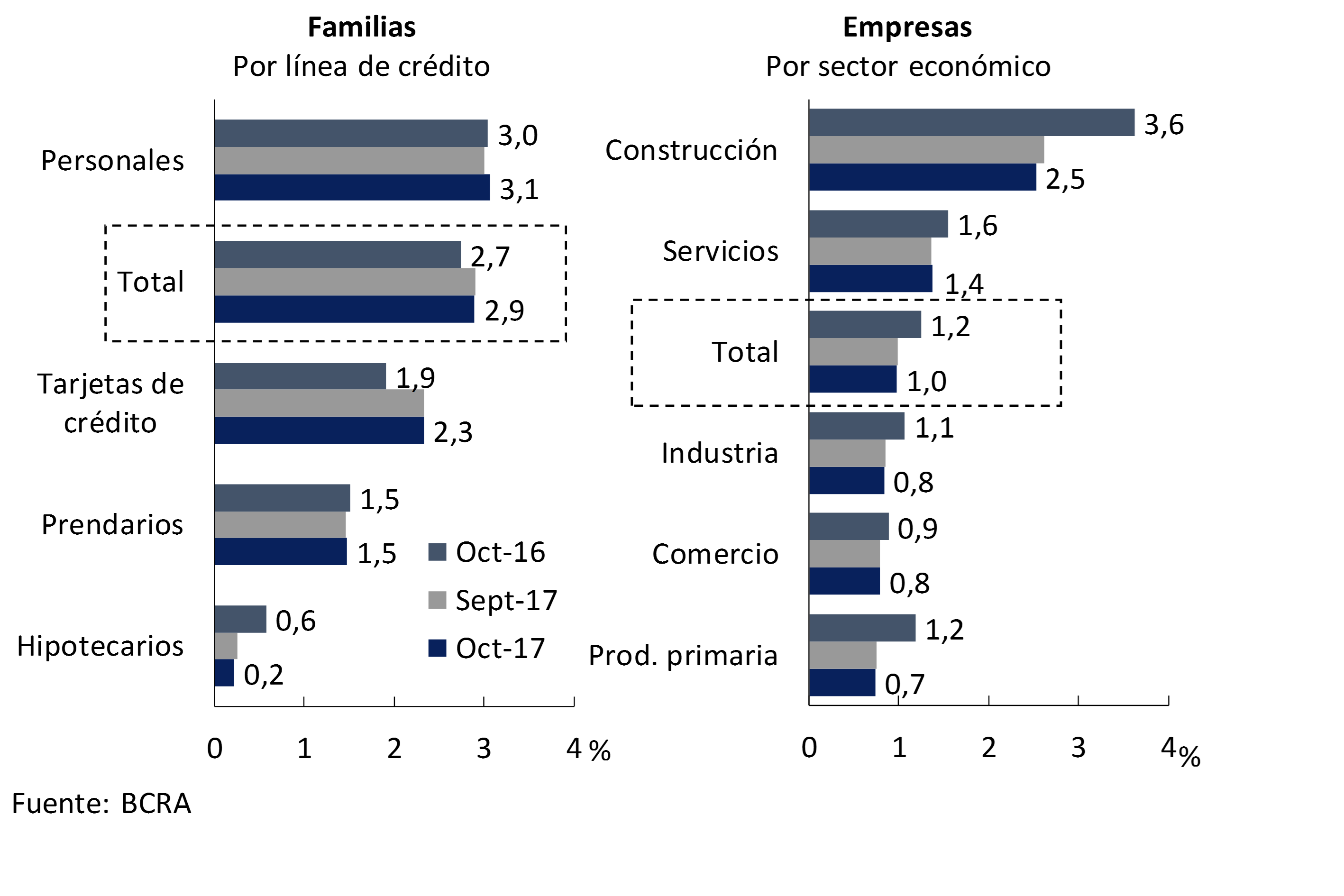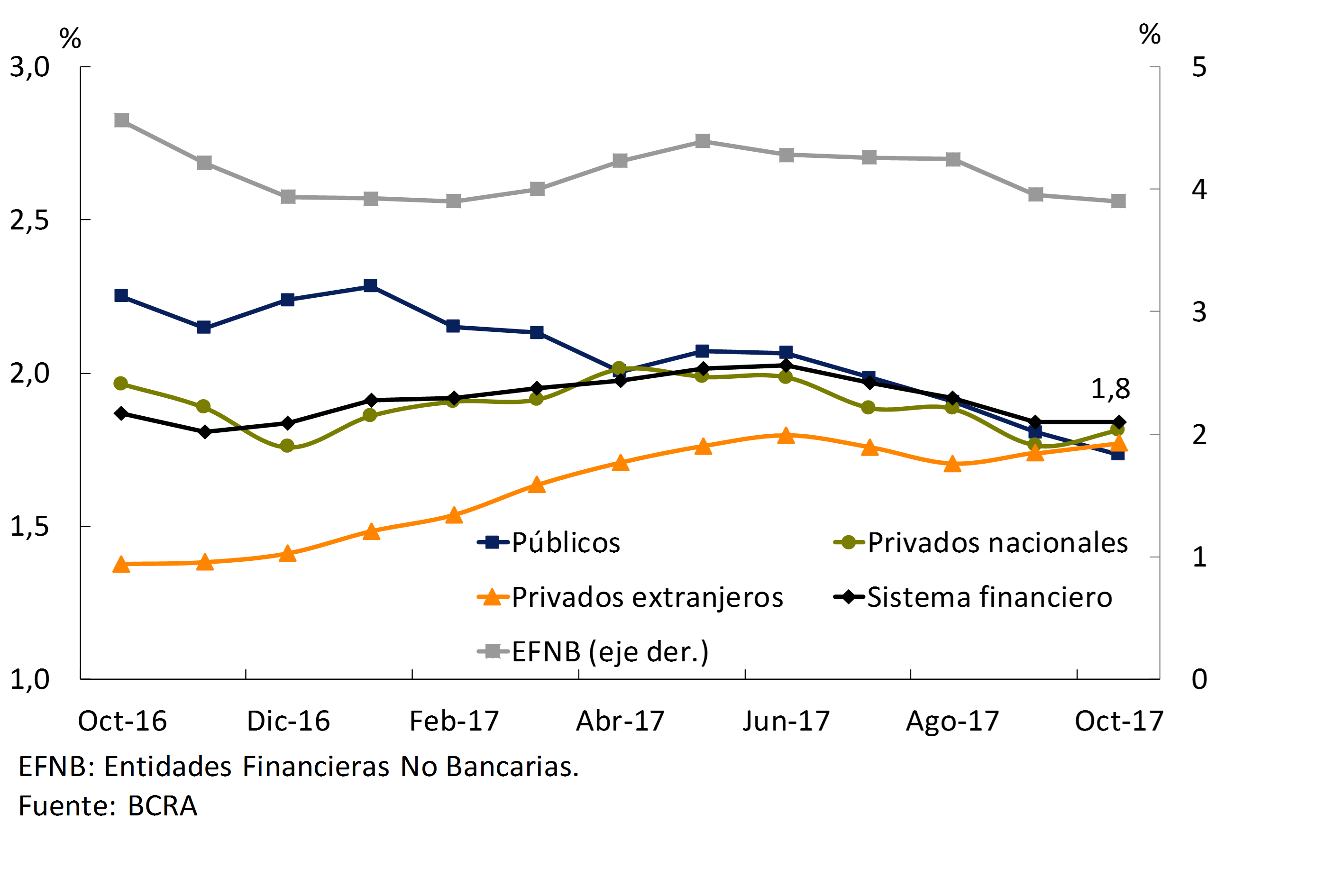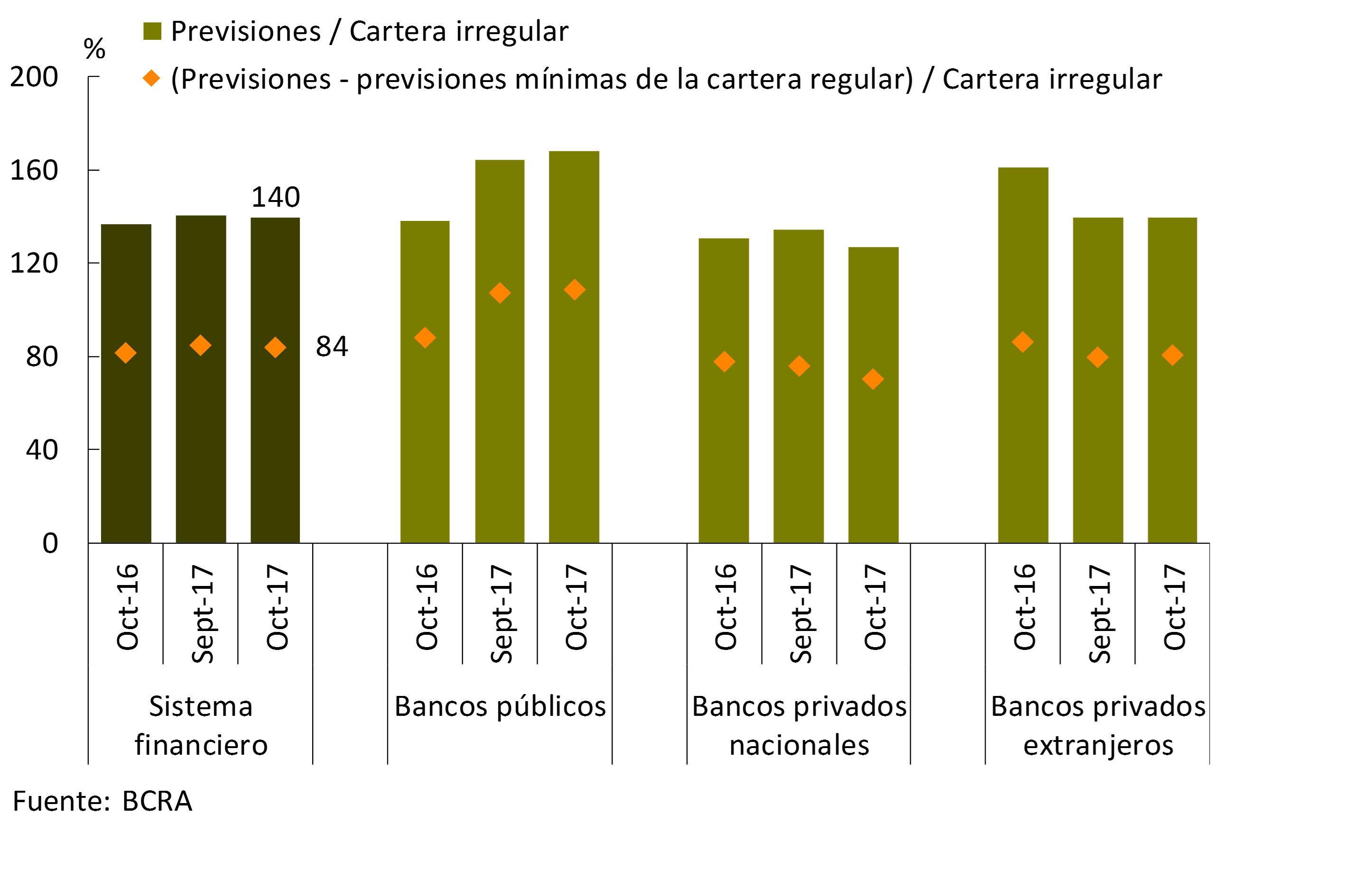 • En octubre el ratio de irregularidad de las financiaciones al sector privado se ubicó en 1,8%, sin cambios con respecto a septiembre. En un contexto de sostenido crecimiento del crédito, en los últimos doce meses el indicador de morosidad se redujo levemente en comparación con el nivel de octubre de 2016. La irregularidad de los préstamos a las familias representó 2,9% del crédito del segmento en el mes, mientras que la correspondiente al crédito a las empresas se situó en 1% —ambos sin cambios mensuales de magnitud—. Las previsiones contables representaron 140% de la cartera en mora a nivel agregado.