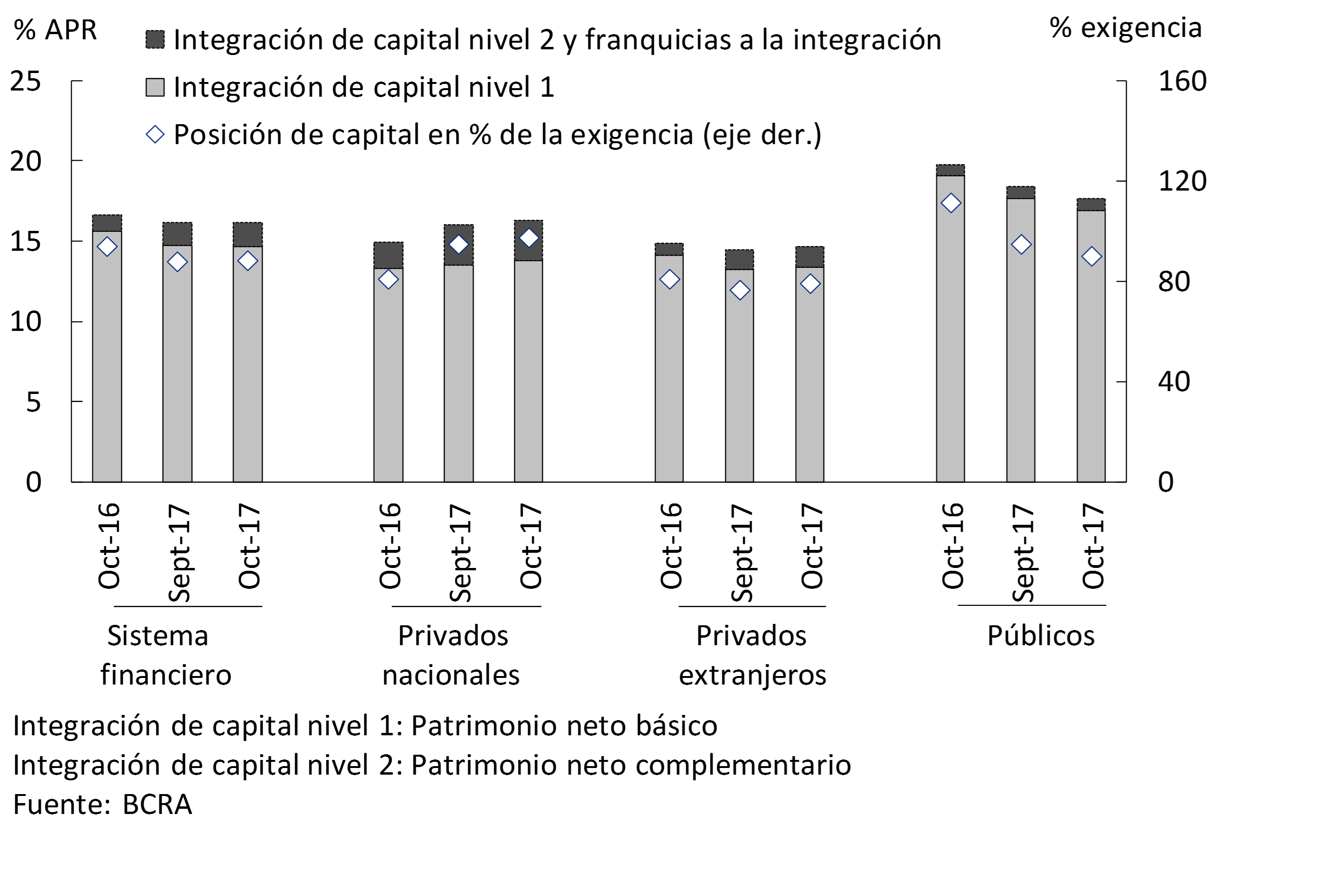 • En octubre los indicadores de solvencia continuaron siendo elevados para el sistema financiero agregado. El ratio de integración de capital regulatorio del sector totalizó 16,2% de los activos ponderados por riesgo (APR) en el mes. El capital Nivel 1 representó 14,7% de los APR en el período. En el marco de los requisitos normativos vigentes el exceso de integración de capital alcanzó 88% de la exigencia.
