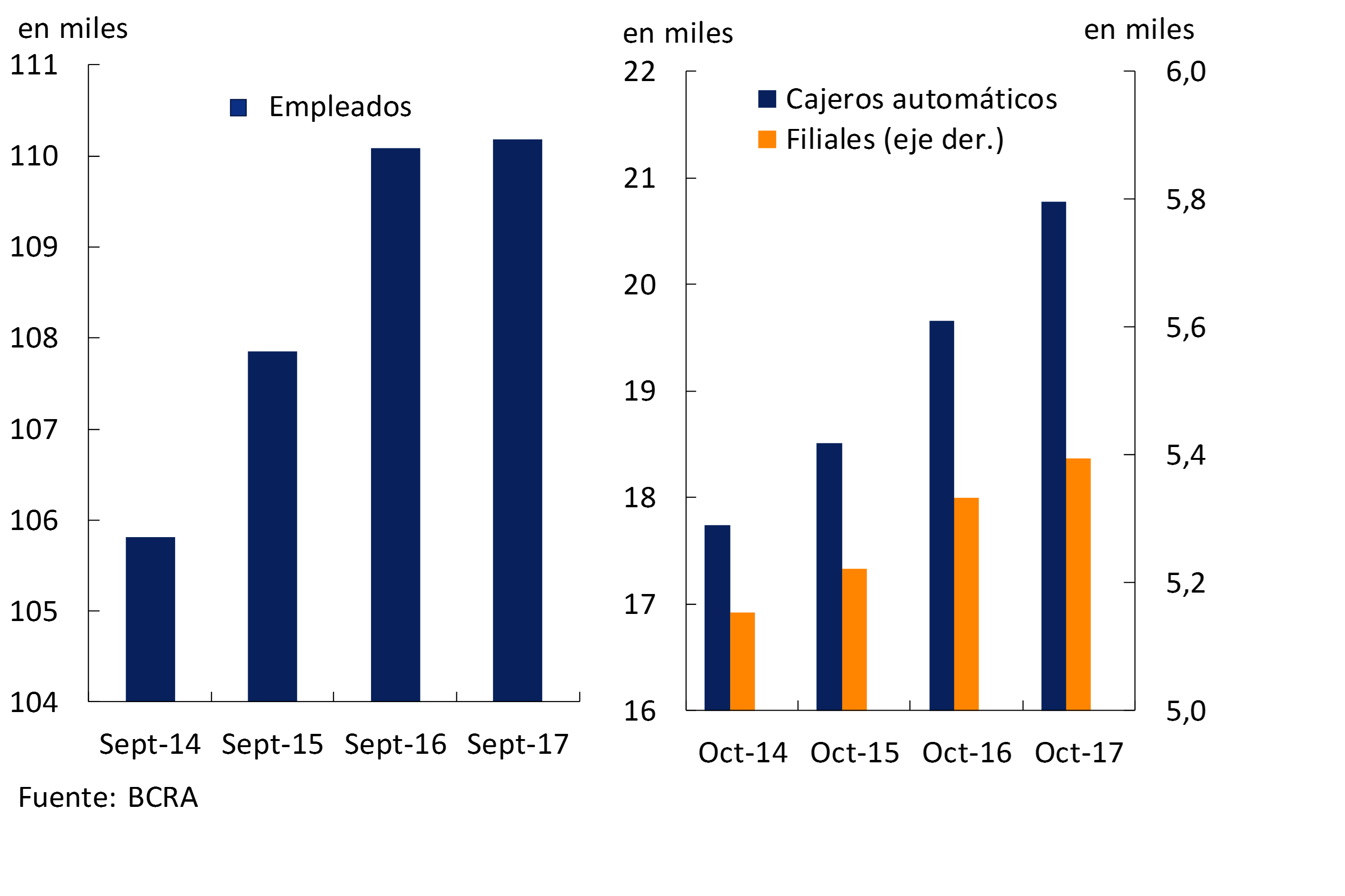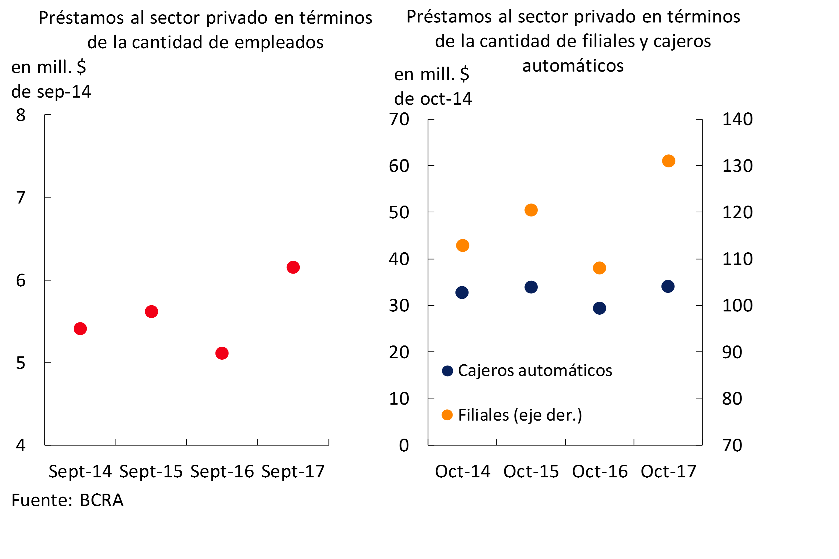 Este desempeño se da conjuntamente con un mayor aprovechamiento de la infraestructura bancaria. A octubre la cantidad de cajeros automáticos ascendió a 20.776, aumentando 5,7% con respecto al mismo período de 2016 (ver Gráfico 2). Las filiales bancarias totalizaron 5.395 en el inicio del cuarto trimestre del año, evidenciando un incremento de 1,2% i.a. Por su parte, la dotación de personal alcanzó 110.184 a septiembre —última información disponible—, sin cambios significativos con respecto a un año atrás. A partir del destacado dinamismo del crédito al sector privado, los ratios entre el saldo real de préstamos y cajeros, sucursales y personal bancario aumentaron en el último año (ver Gráfico 3).