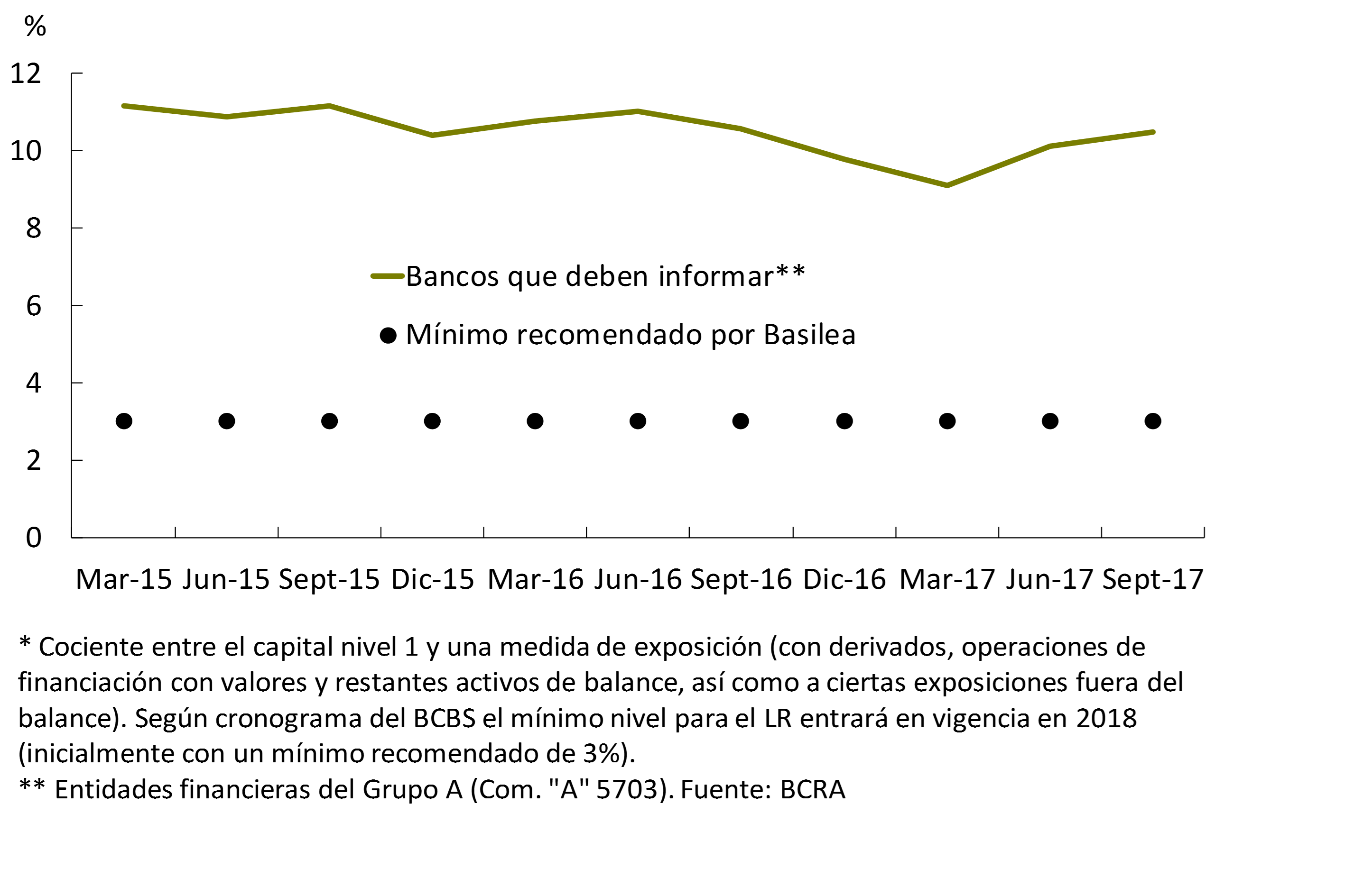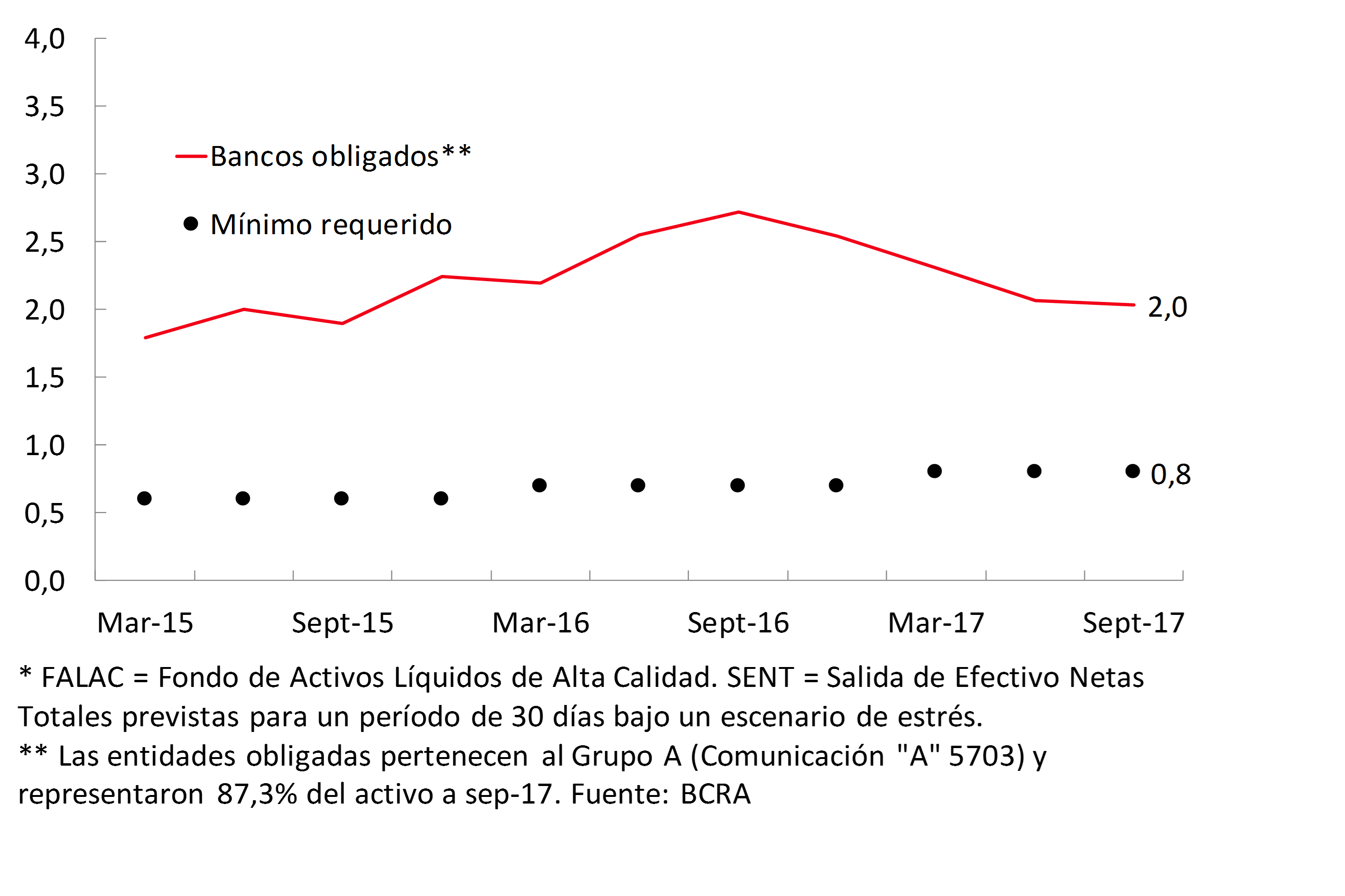 En relación al ratio de cobertura de liquidez (LCR, por sus siglas en inglés), el conjunto local de entidades financieras de mayor tamaño7 continuó presentando niveles que superan a los mínimos recomendados por el Comité de Basilea (ver Gráfico 9). A septiembre —última información disponible— los bancos más grandes presentaron un registro promedio para el ratio de cobertura de liquidez del orden de 2, levemente menor que el registrado a mediados de 2017 y en septiembre de 2016. Sin embargo, el nivel actual superó holgadamente el mínimo requerido en el ámbito local, que está en línea con el cronograma definido por el comité de Basilea.