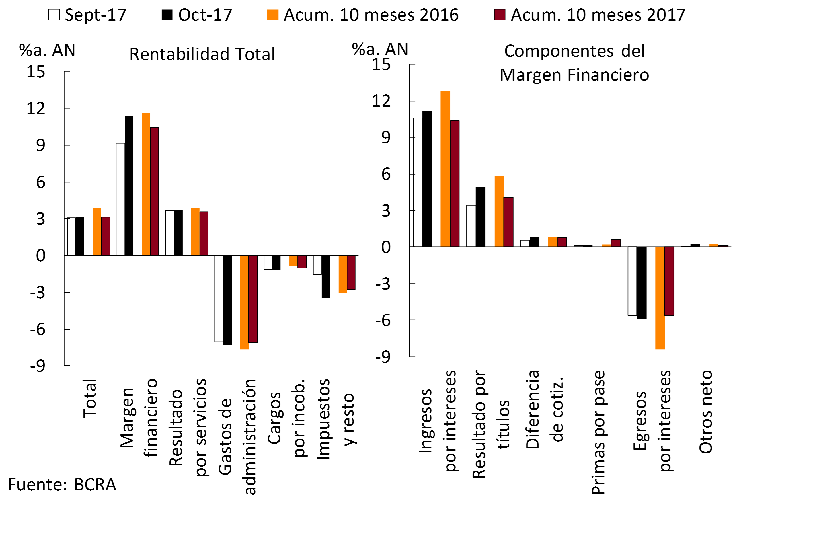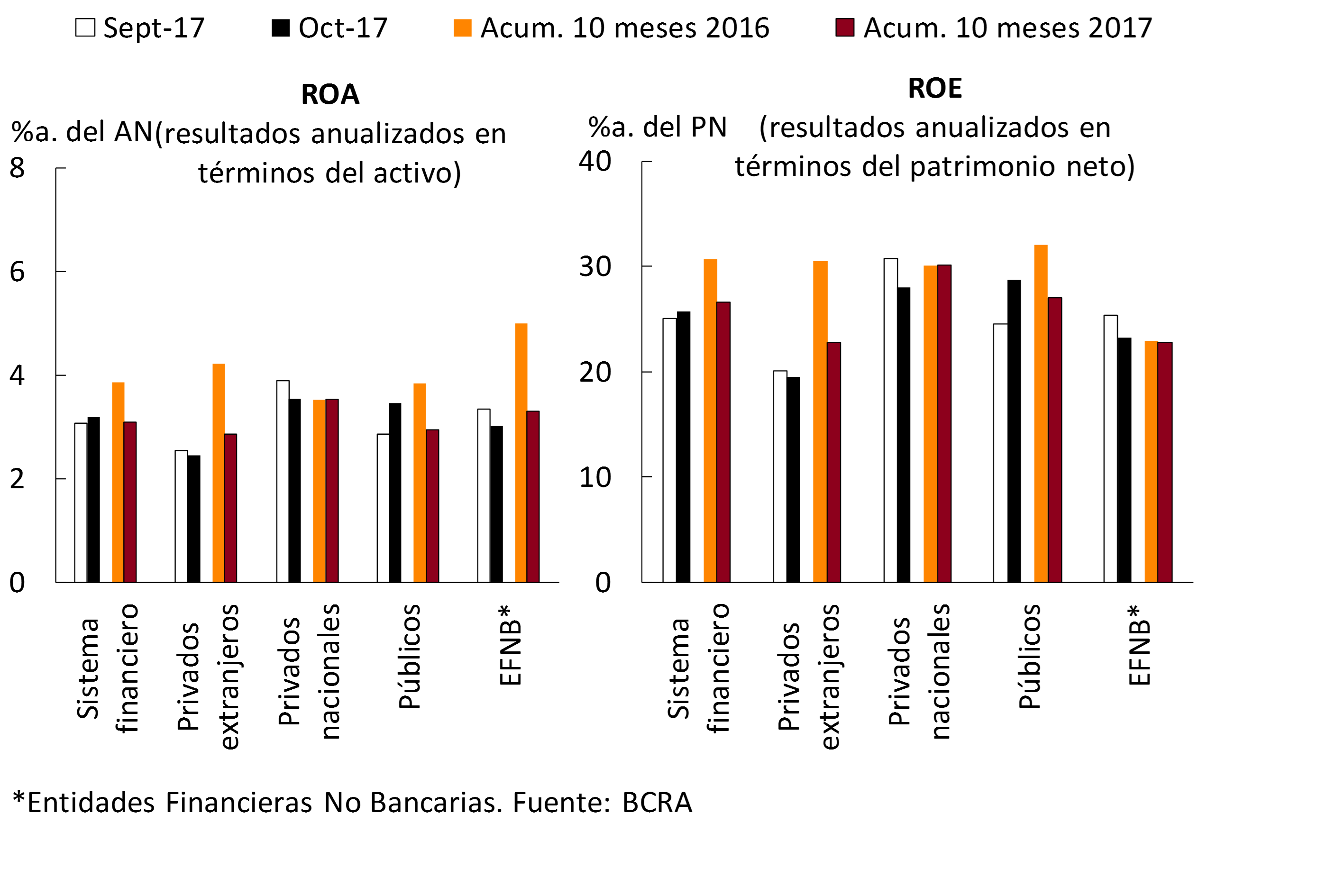 • El conjunto de entidades financieras devengó resultados positivos por 3,2%a. del activo en octubre. En el acumulado de diez meses del año las ganancias del sistema financiero ascendieron a 3,1%a. del activo, cayendo 0,8 p.p. con respecto al mismo período de 2016.