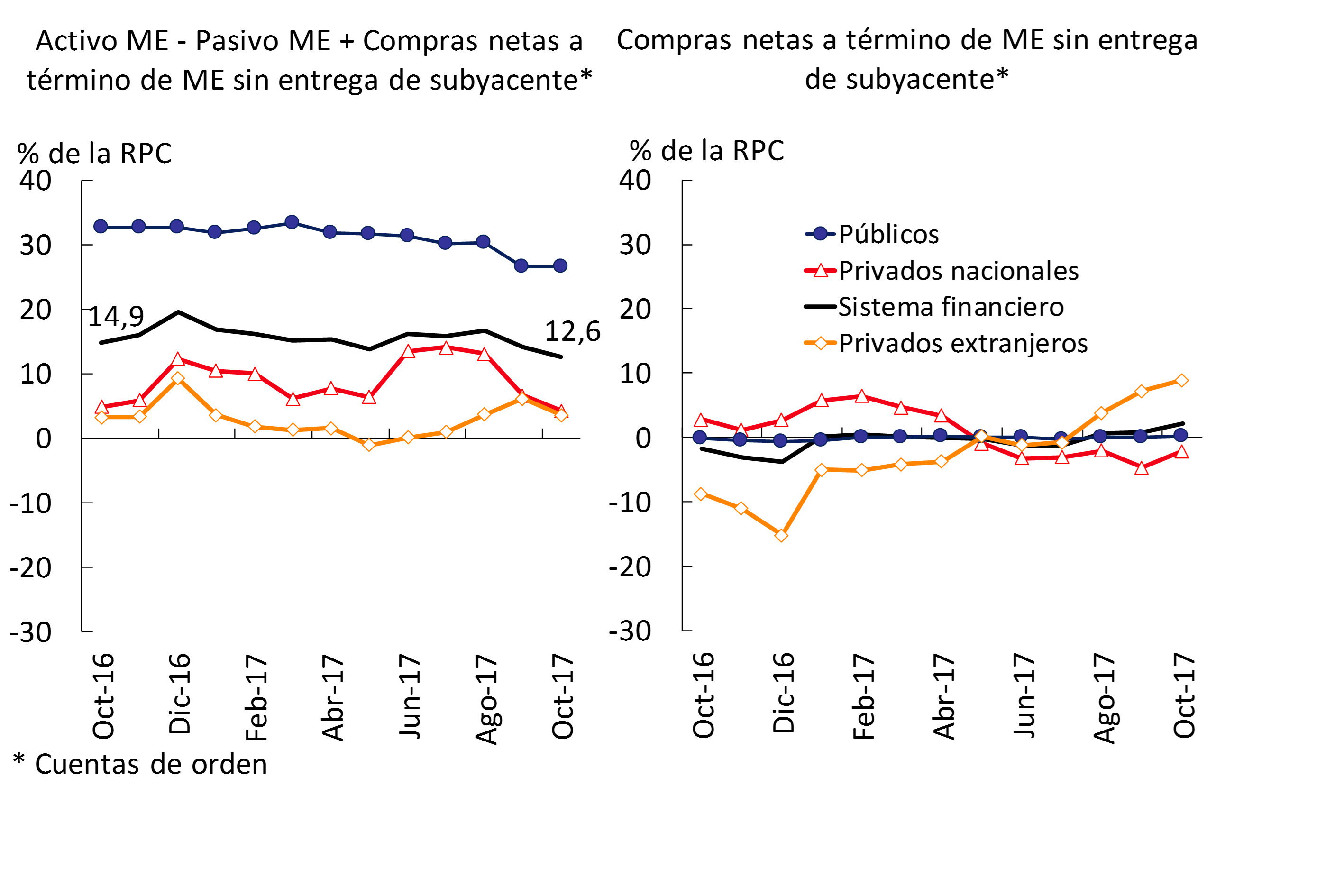 El dinamismo de la intermediación financiera con el sector privado se plasmó en parte con un mayor volumen de operaciones en moneda extranjera y en UVA —partidas con ajuste CER—. En este contexto, el BCRA continúa monitoreando la evolución de los rubros patrimoniales en distinta denominación. El descalce agregado de moneda extranjera en términos de la Responsabilidad Patrimonial Computable —RPC— viene mostrando una acotada volatilidad en los últimos meses (ver Gráfico 5). En octubre este descalce se ubicó en 12,6% de la RPC, 1,5 p.p. y 2,2 p.p. menos que en el mes pasado y que en el mismo período de 2016. Con respecto a las partidas que ajustan por CER, se estima que el sistema financiero presentó un descalce activo del orden de 19% de la RPC a octubre6.