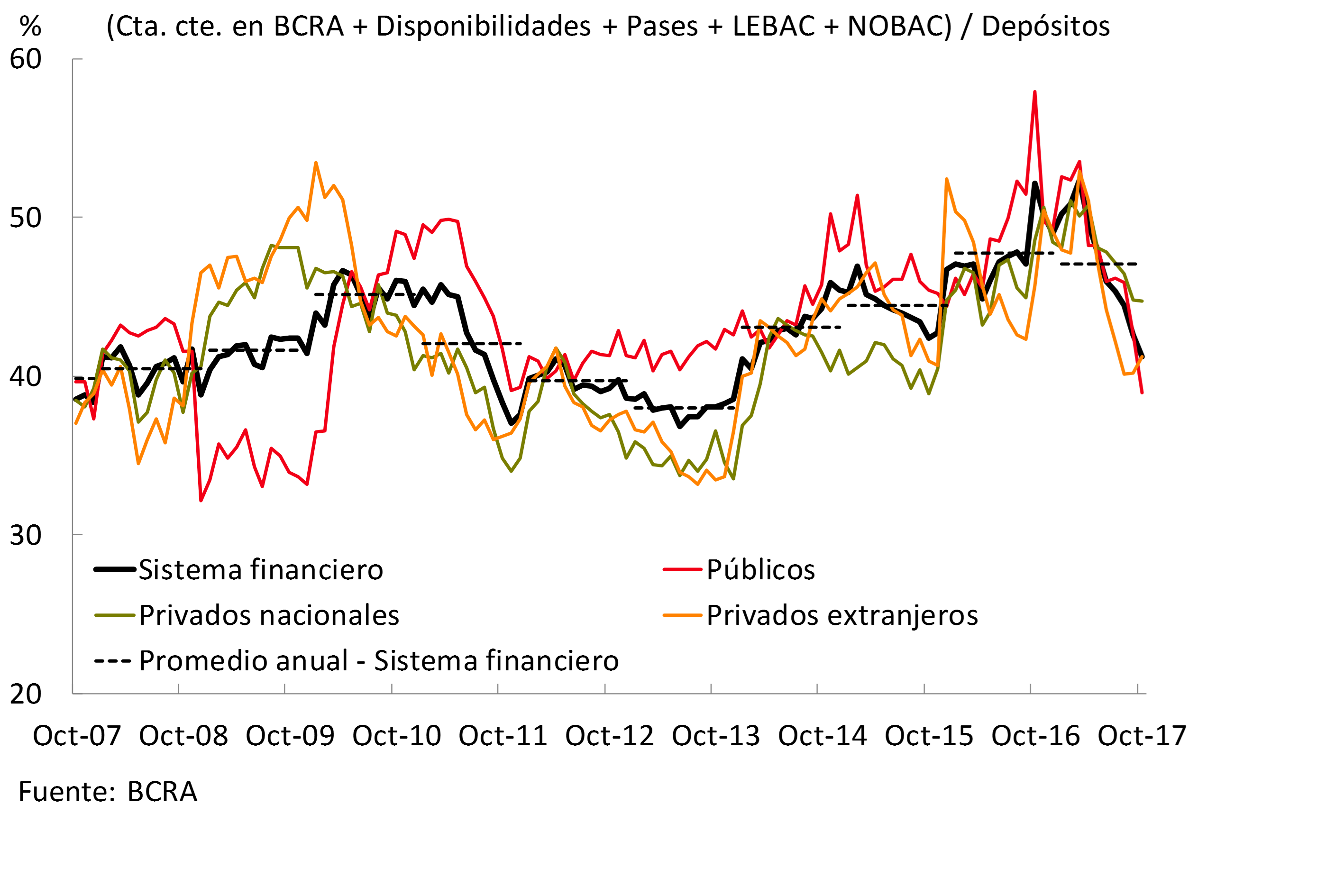 • Desde niveles elevados siguió cayendo la liquidez del sistema financiero, consistente con un crecimiento del crédito mayor al aumento de los depósitos del sector privado. El indicador amplio de liquidez —incorporando LEBAC y pases con el BCRA— del conjunto de bancos alcanzó 41,3% de los depósitos en octubre, 1,4 p.p. menos que el mes pasado y 11,1 p.p. por debajo del máximo alcanzado en marzo de 2017. Cabe considerar que el nivel actual del indicador amplio está en línea con el promedio registrado en los últimos diez años. Por su parte, el ratio de liquidez acotado —sin tenencias de LEBAC ni pases— representó 24,9% de los depósitos en el mes, 1,8 p.p. menos que el registro de septiembre.
