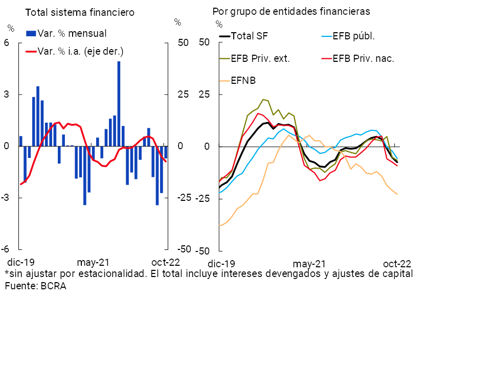 El saldo del activo total del sistema financiero se redujo 0,9% en términos reales en octubre (+5,3% nominal), desempeño generalizado entre los distintos grupos de entidades. En los últimos 12 meses, el activo total del sector acumuló una disminución de 3,1% real (+82,1% nominal).