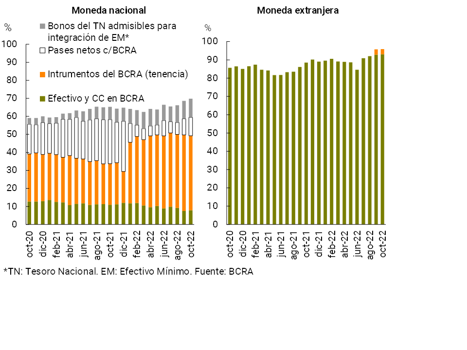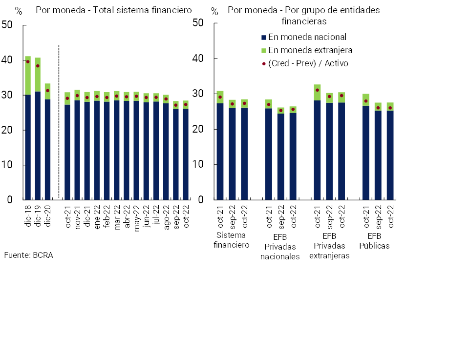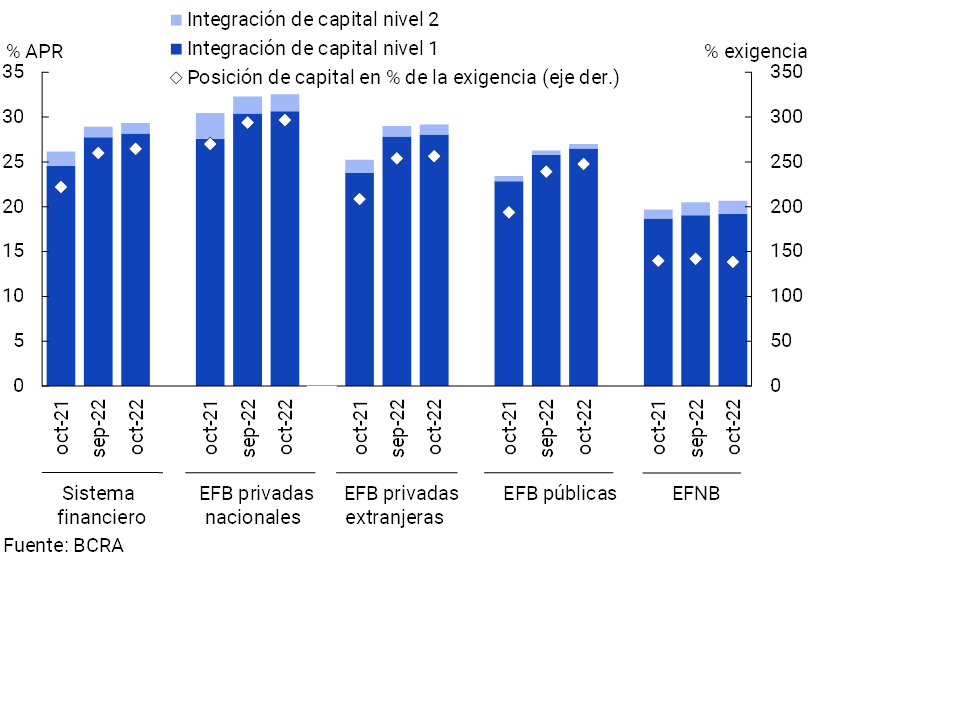 • Los principales indicadores de liquidez y de solvencia para el agregado del sistema financiero superan los niveles verificados para el promedio de los últimos 10 años. En octubre los activos líquidos en sentido amplio del sistema financiero totalizaron 73,5% de los depósitos, 1,2 p.p. más que en septiembre y 4,2 p.p. superior en la comparación interanual. La integración de capital regulatorio (RPC) del agregado de entidades se ubicó en 29,3% de los activos ponderados por riesgo (APR) en octubre, 0,4 p.p. y 3,2 p.p. por encima del registro del mes anterior y de igual período de 2021. En el mes la posición de capital -RPC neta del requisito normativo mínimo- del sistema financiero totalizó 265% de la exigencia regulatoria en y 40,6% del saldo de crédito al sector privado neto de previsiones.