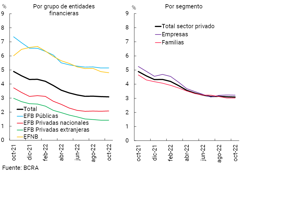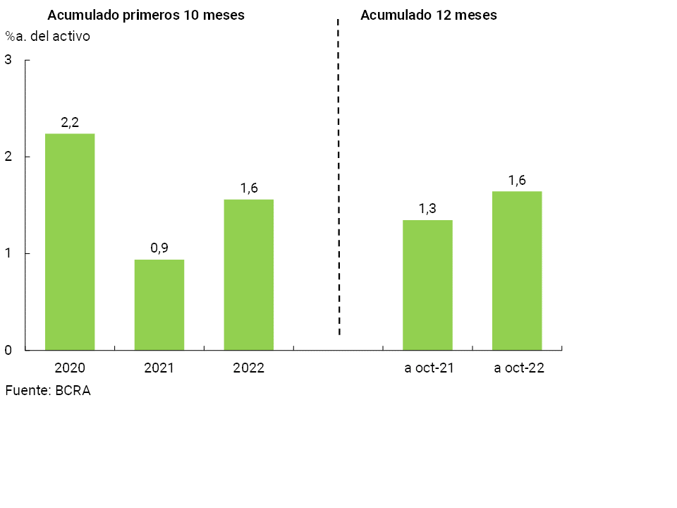 • Respecto a los indicadores de rentabilidad del sector, en el acumulado de los 10 primeros meses de 2022 el sistema financiero devengó un resultado total integral en moneda homogénea equivalente a 1,6% anualizado (a.) del activo (ROA) y a 9,1%a. del patrimonio neto (ROE), niveles mayores que los registros del mismo período de 2021, aunque inferiores a los de esa parte de 2020.