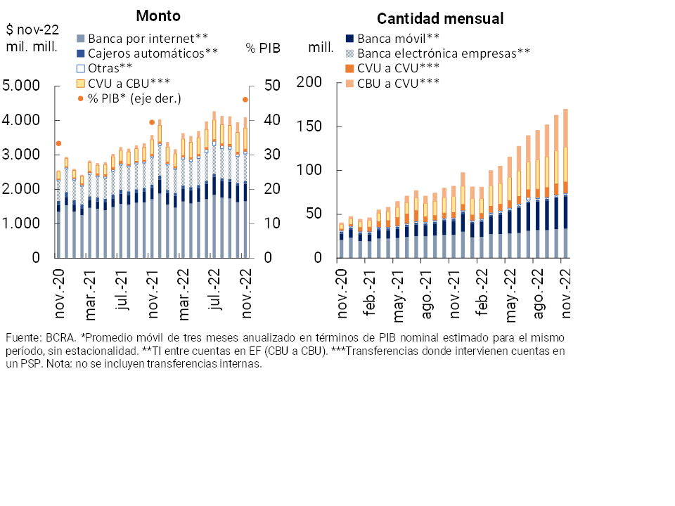 Las transferencias inmediatas (TI) continuaron aumentando significativamente. Considerando datos a noviembre de 2022, la cantidad de TI creció 4,2% con respecto a octubre y 107,8% i.a. (3,7% y 13,9% i.a. en montos reales). Este desempeño interanual estuvo impulsado por un incremento generalizado en sus componentes, destacándose las TI donde intervienen cuentas en proveedores de servicios de pago —PSP— desde y/o hacia CVU. Dentro de estas últimas operaciones, se destaca el dinamismo interanual de las operaciones desde EF hacia PSP (CBU a CVU), en cantidades (+272,7%) y en montos reales (+131,6%). De esta manera, las operaciones donde interviene una CVU continúan ganando participación en el total de TI: llegando a re-presentar 56,3% en cantidades (+12,6 p.p. i.a.) y 24,6% en montos (+7,6 p.p. i.a.). Se estima que el monto de las TI operado en los últimos tres meses (anualizado) representó 46,1% del PIB (+6,6 p.p. que en el mismo mes del año anterior, ver Gráfico 12)5.