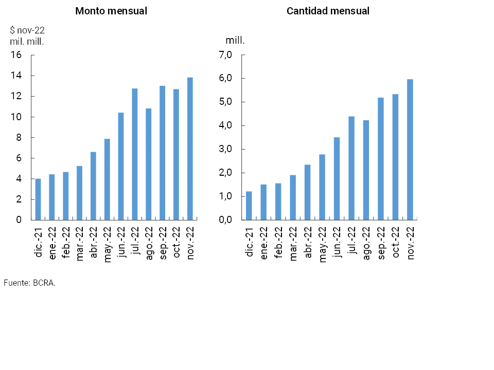 Finalmente, durante noviembre el ratio de rechazo de cheques por falta de fondos en términos del total compensado se incrementó respecto al mes anterior (+0,08pp, hasta 0,83% en cantidades y +0,02p.p. hasta 0,61% en montos). Estos niveles resultan levemente superiores al promedio de 2022 (0,67% en cantidades y 0,53% en montos reales).
