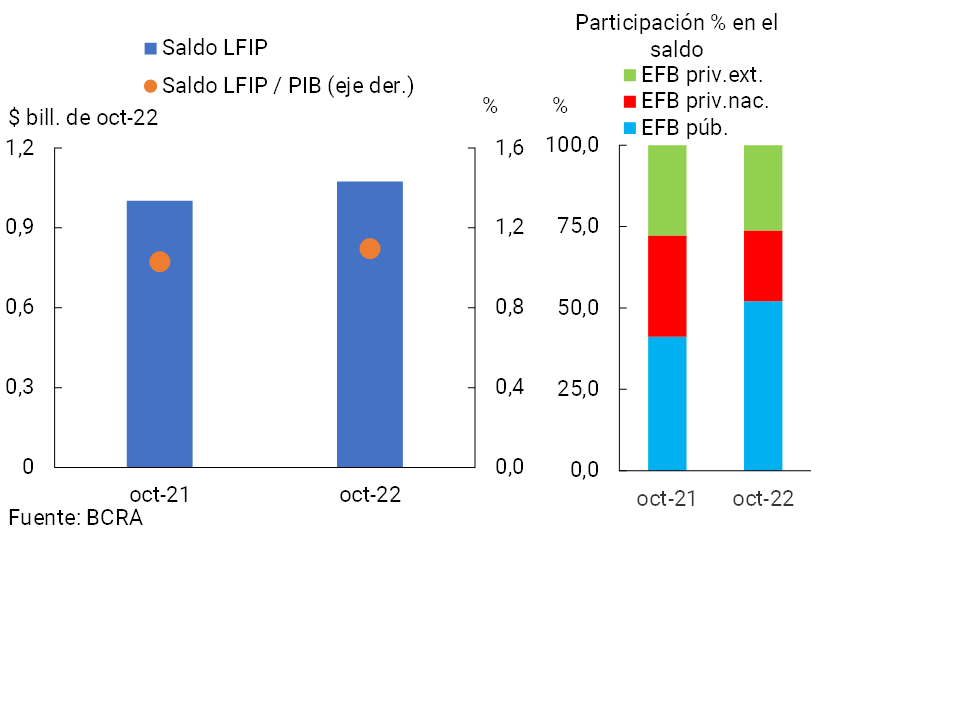 • En el mes el saldo de financiamiento en pesos al sector privado expresado en términos reales disminuyó levemente con respecto a septiembre (+5,5% nominal), desempeño verificado en casi todas las líneas crediticias. Por su parte, la Línea de financiamiento para la inversión productiva de MiPyMEs (LFIP) mantiene su dinamismo, desde su lanzamiento hasta noviembre de 2022 se desembolsaron $3,6 billones, financiando a 350.400 empresas. Con datos a octubre, se estima que el saldo de financiamiento estimado de la LFIP representó 13,6% del crédito total a al sector privado y 1,1% del PIB.