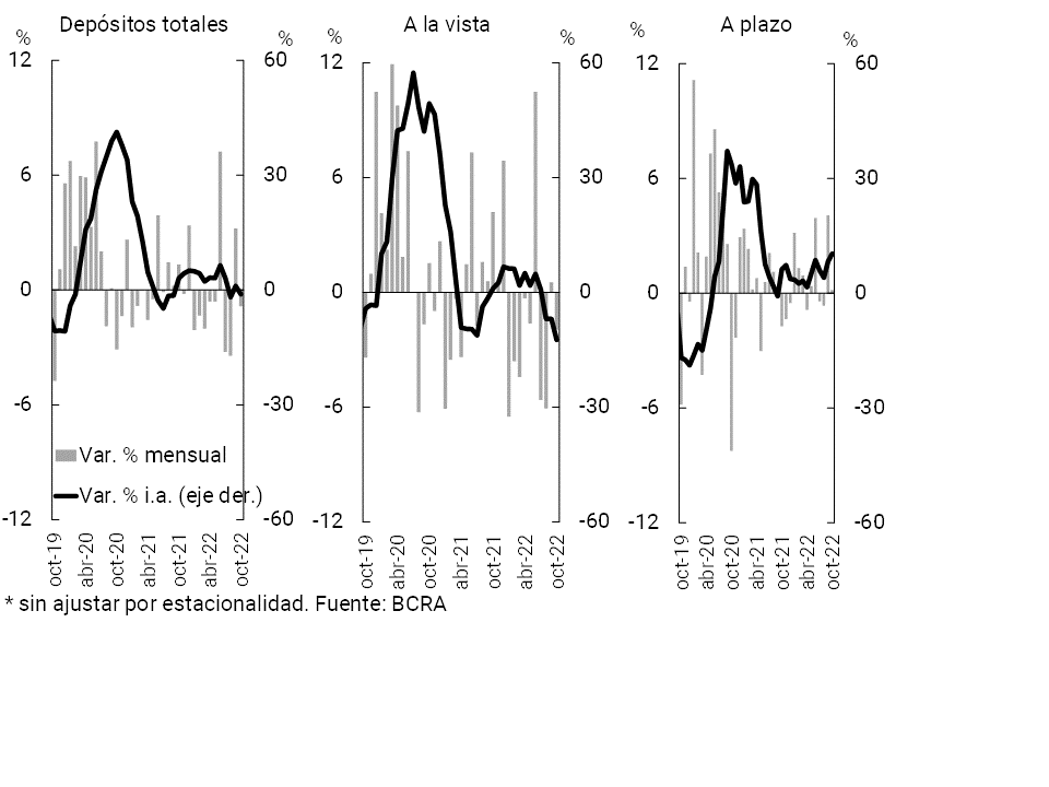 Al diferenciar por tipo de depósitos a plazo del sector privado, en el mes los tradicionales (a tasa de interés fija) se incrementaron 1,7% real (+8,1% nominal), acumulando un aumento interanual de 14,5% real (+115,2% i.a. nominal). En tanto, con respecto a fines de septiembre el saldo de los depósitos denominados en UVA disminuyó 11,3% (-5,7% nominal), si bien acumuló un crecimiento de 33% i.a. real (+150% i.a. nominal).