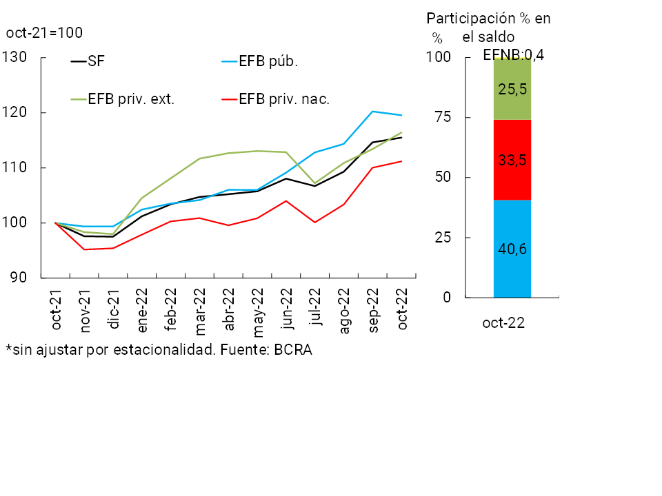 Por el lado del segmento en moneda extranjera, en octubre el financiamiento el sector privado en dicha denominación se incrementó 2,7% (en moneda de origen). De esta manera el saldo de crédito total (en moneda nacional y extranjera) al sector privado se redujo 0,4% real con respecto a septiembre (+5,9% nominal), acumulando una caída interanual de 10,5% real (+68,1 % i.a. nominal).