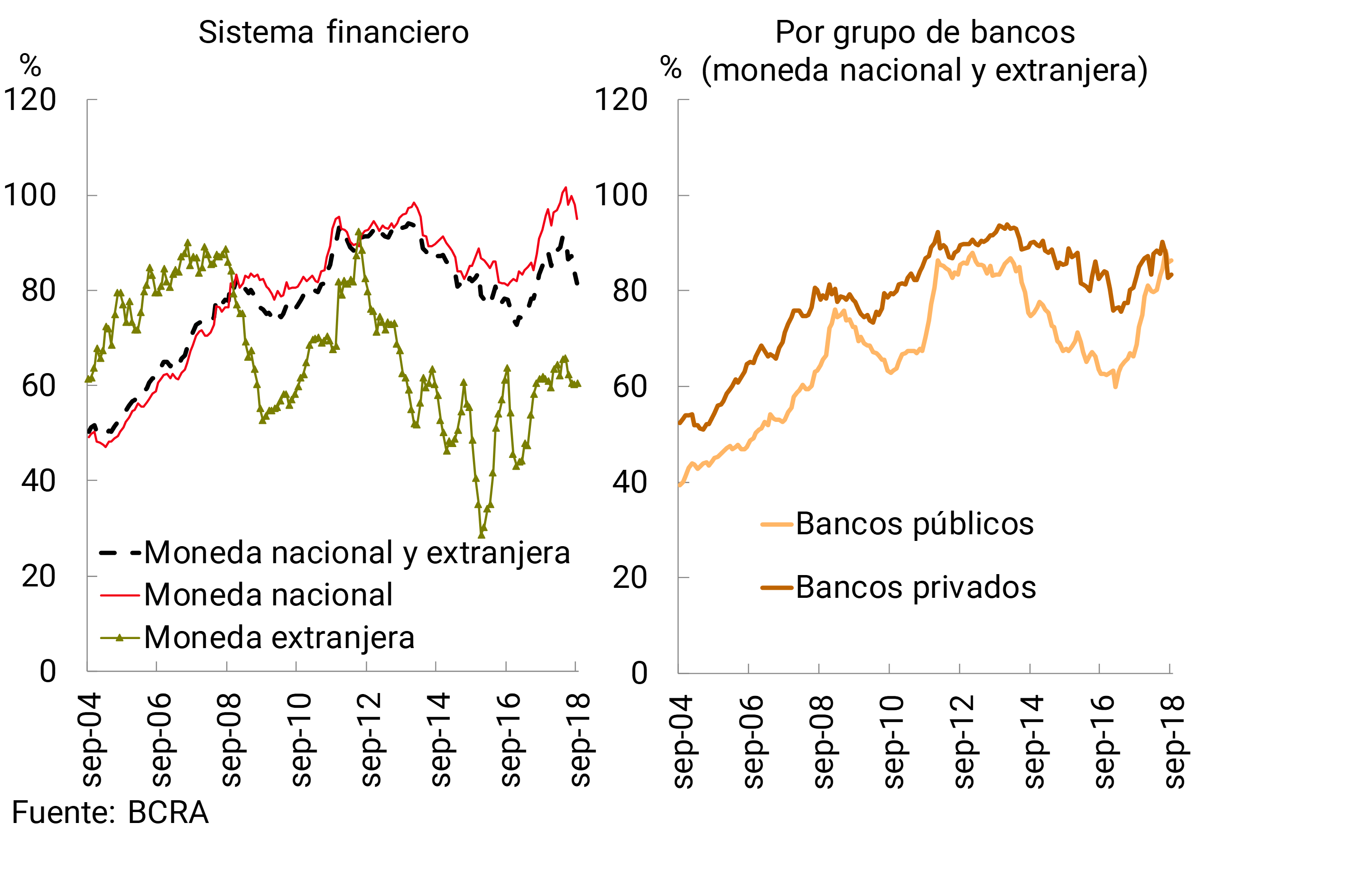 Al igual que en los últimos meses, la intermediación financiera del conjunto de bancos con el sector privado continúo moderándose en septiembre. En este marco, el activo total del sistema financiero se redujo 2,7% en términos reales en el período.6 Con un saldo de depósitos que mostró un crecimiento nominal mayor que el registrado por el crédito, la relación entre ambos siguió reduciéndose en el mes, hasta 82% a nivel agregado (ver Gráfico 1). Esto tuvo su correlato en términos de menor exposición crediticia y mayores niveles de liquidez para el sector.7