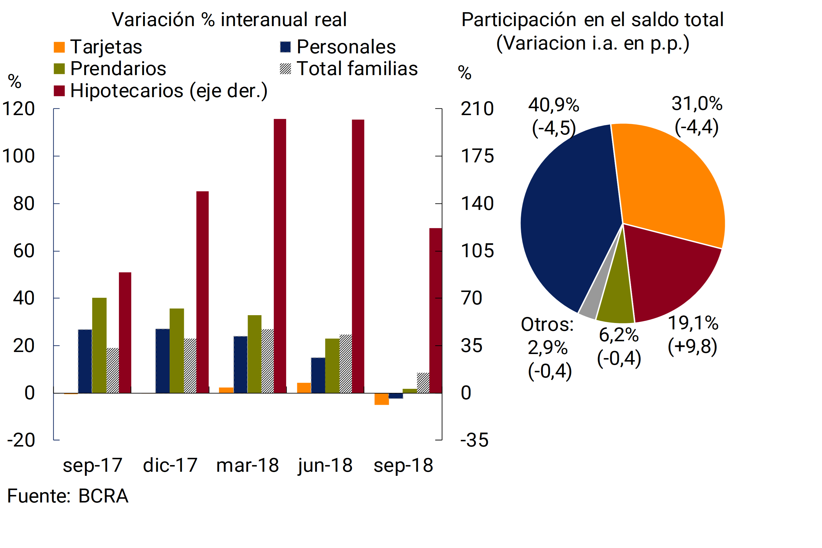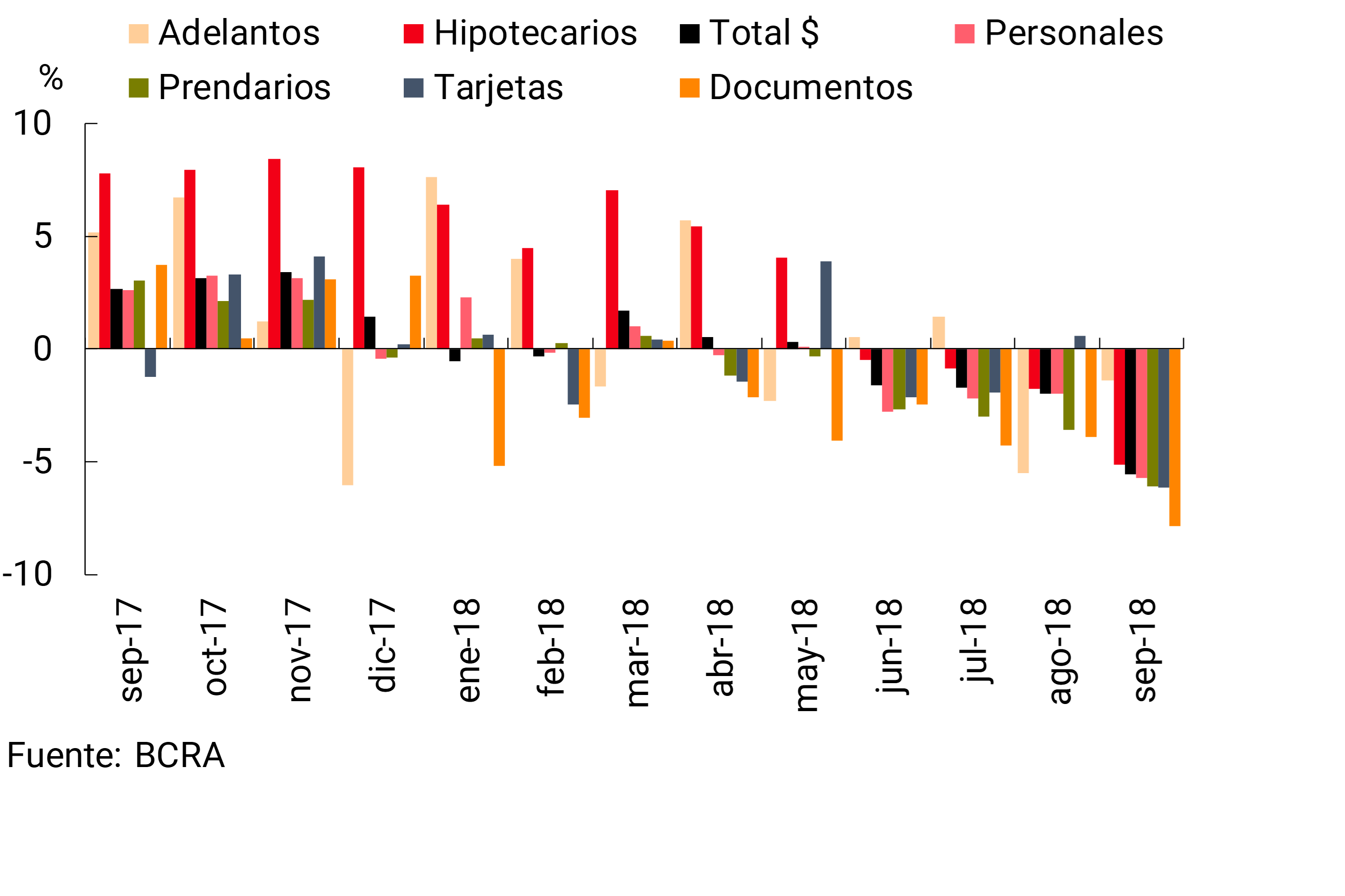 El financiamiento a las familias disminuyó 5,8% al ajustar por inflación en el mes (+0,3% nominal), verificándose una caída generalizada en todas las líneas crediticias. En términos interanuales el saldo de crédito a los hogares acumuló un crecimiento de 8,4% en términos reales en septiembre, por debajo de las variaciones registradas en meses anteriores (ver Gráfico 13).