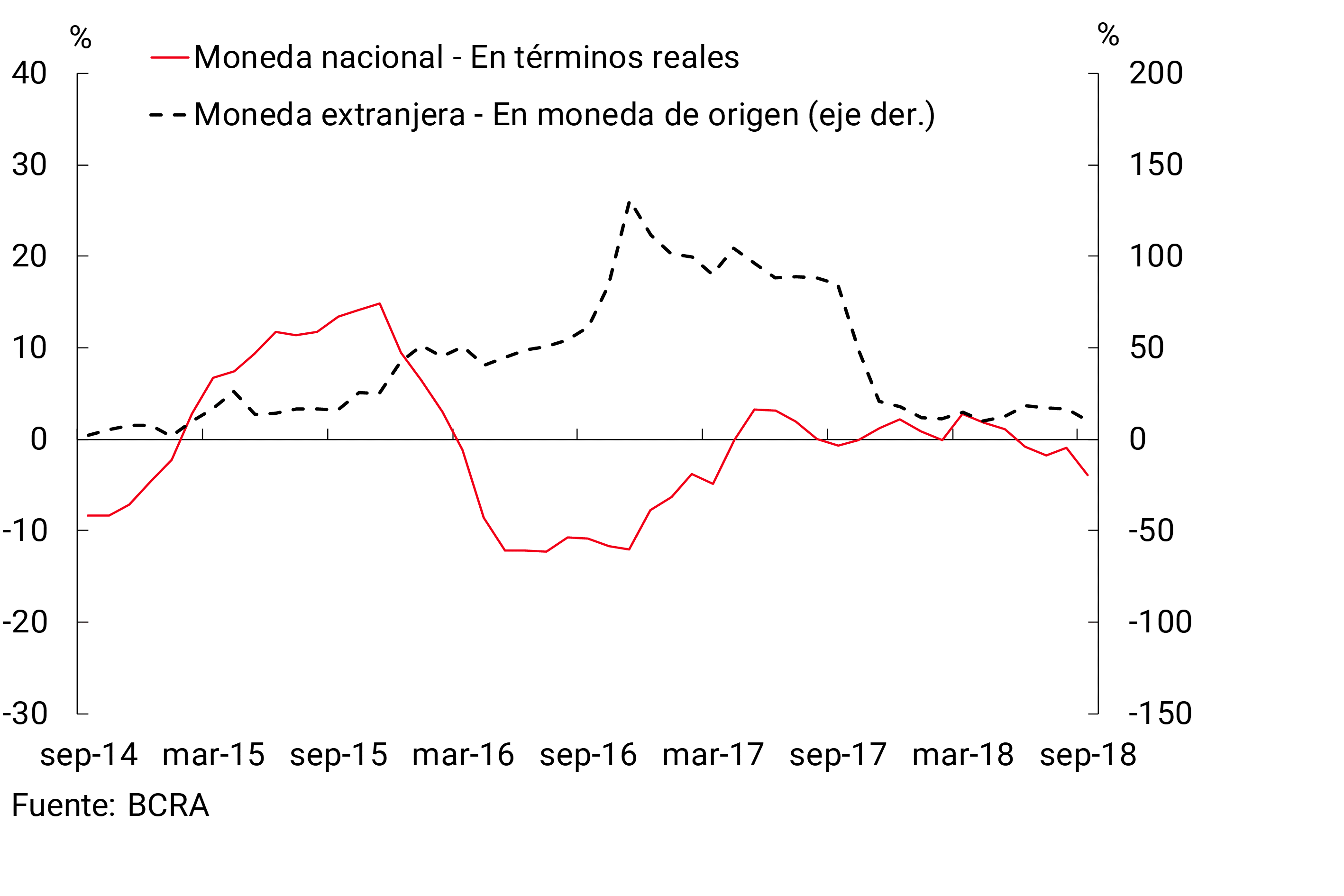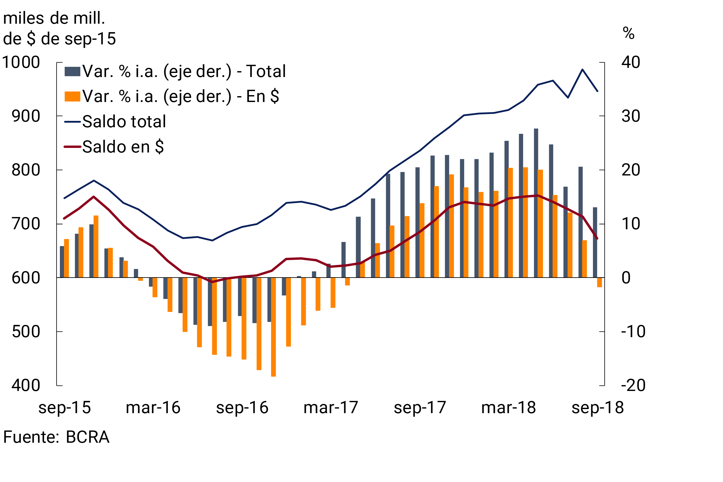 • La ponderación relativa del crédito al sector privado en el activo bancario se redujo en septiembre. Esto recogió el efecto de la caída mensual del saldo de financiamiento en pesos a este sector, de 5,6% real con respecto a agosto (-1,7% i.a. real). Los depósitos del sector privado presentaron un mejor desempeño relativo que el crédito en el mes, aunque también se redujeron. La caída mensual fue de 2,6% en el segmento en moneda nacional al ajustar por inflación (-3,9% i.a. real). No obstante, a partir de octubre los depósitos en pesos del sector privado recobraron impulso, con un aumento que superó a la inflación del período dado el destacado dinamismo de los plazos fijos.