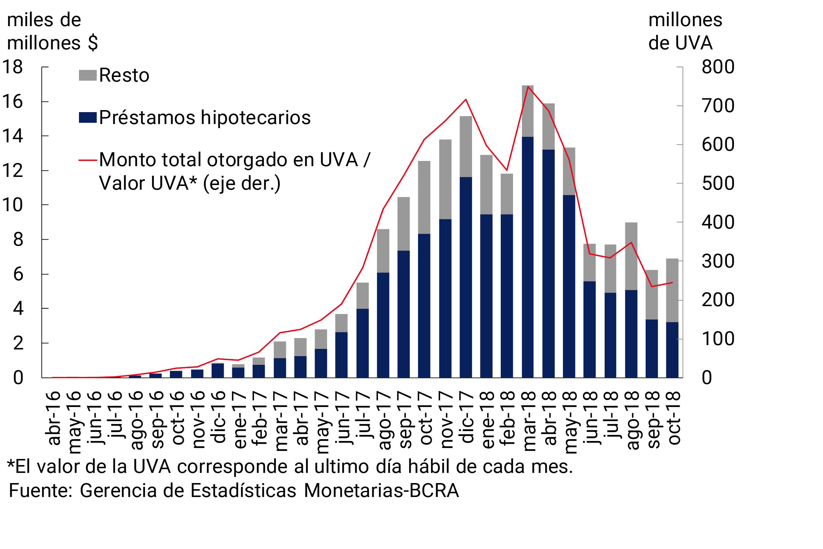 Los créditos en UVA también presentan un menor dinamismo desde mediados de año (ver Gráfico 14). En octubre los créditos totales otorgados en UVA a personas humanas y jurídicas totalizaron $6.913 millones (245 millones de UVA).22 Del total otorgado en UVA en el mes, 47% correspondió a préstamos hipotecarios, 36% a personales y 17% a prendarios. Teniendo en cuenta el saldo del balance del agregado del sistema financiero de septiembre, el financiamiento en UVA al sector privado alcanzó un total de $220.942 millones, correspondiendo 74% a líneas hipotecarias.23
