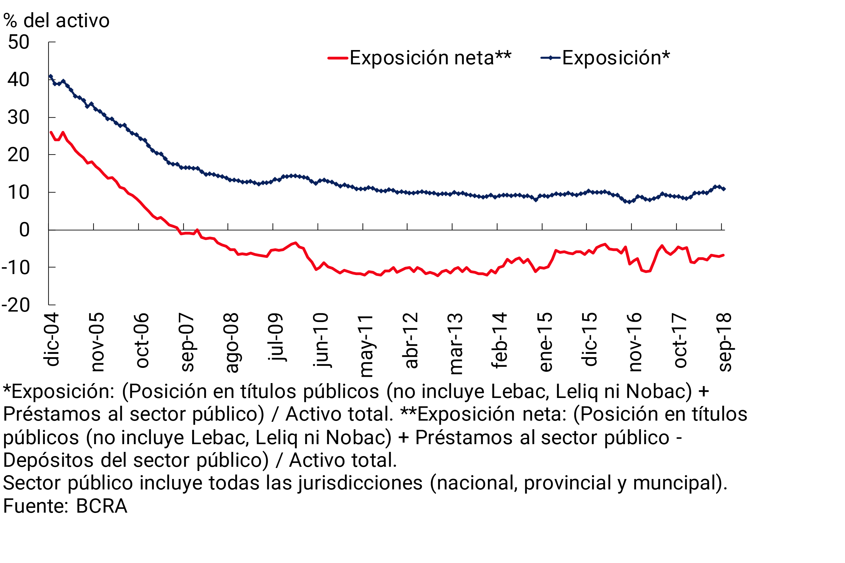 La exposición del sistema financiero al sector público se mantuvo en valores reducidos (ver Gráfico 16). En el cierre del tercer trimestre del año, la exposición bruta del conjunto de entidades financieras al sector público representó 11% del activo total, levemente por encima del nivel de un año atrás. El saldo de depósitos del sector público siguió superando al saldo de crédito a este segmento. Así, el sector público continuó posicionándose como acreedor neto del sistema financiero en un nivel equivalente a 6,6% del activo total en el mes.
