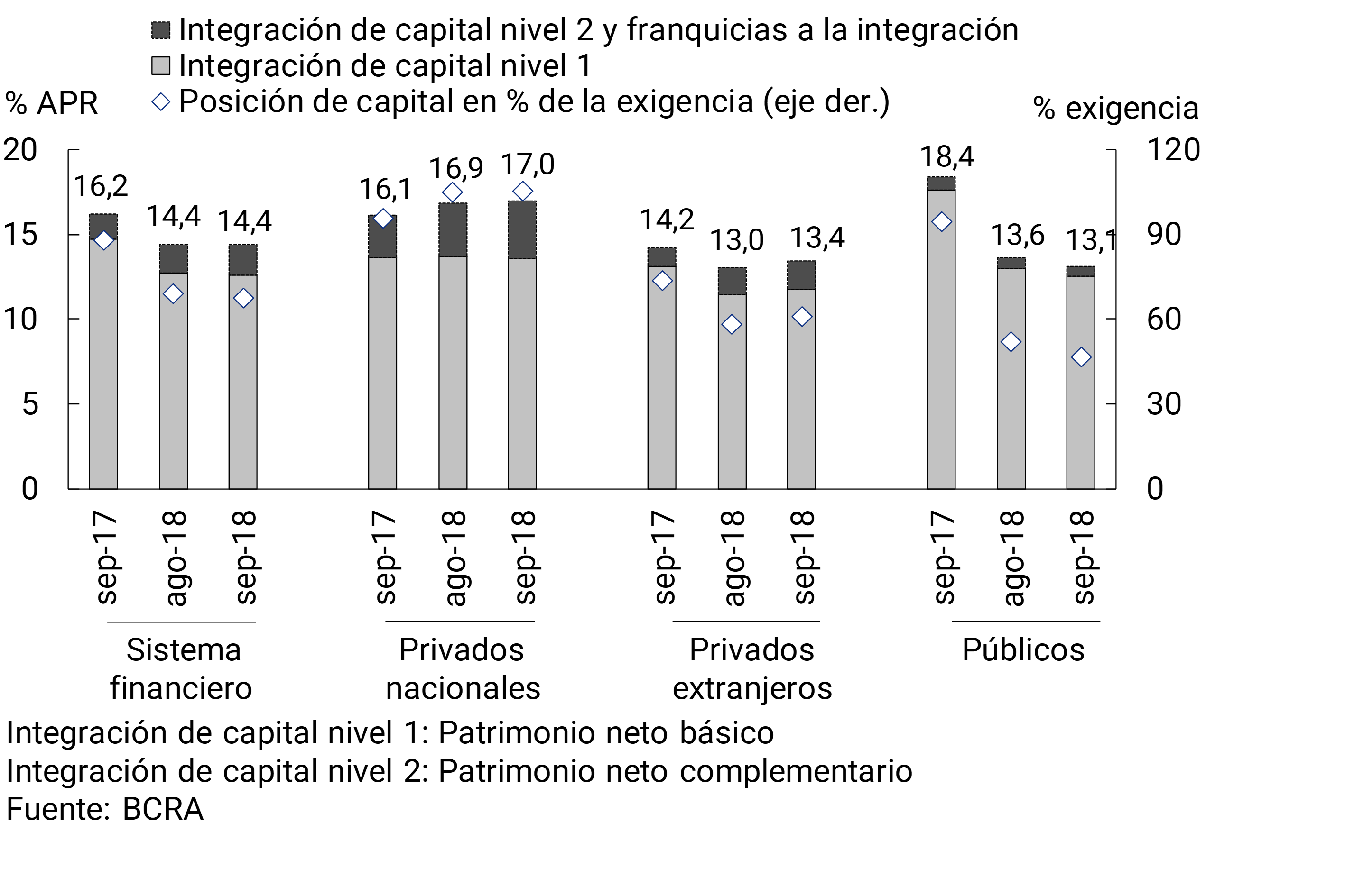 27 Considerando los márgenes de capital regulatorio de Basilea III como requisitos mínimos (si bien no constituyen un mínimo exigible regulatorio, sino que su incumplimiento impone restricciones a la distribución de dividendos), el sistema financiero presentaría un exceso de integración de capital Nivel 1 núcleo. Para mayor detalle, ver Capítulo 2 del Informe de Estabilidad Financiera del Segundo Semestre de 2018.