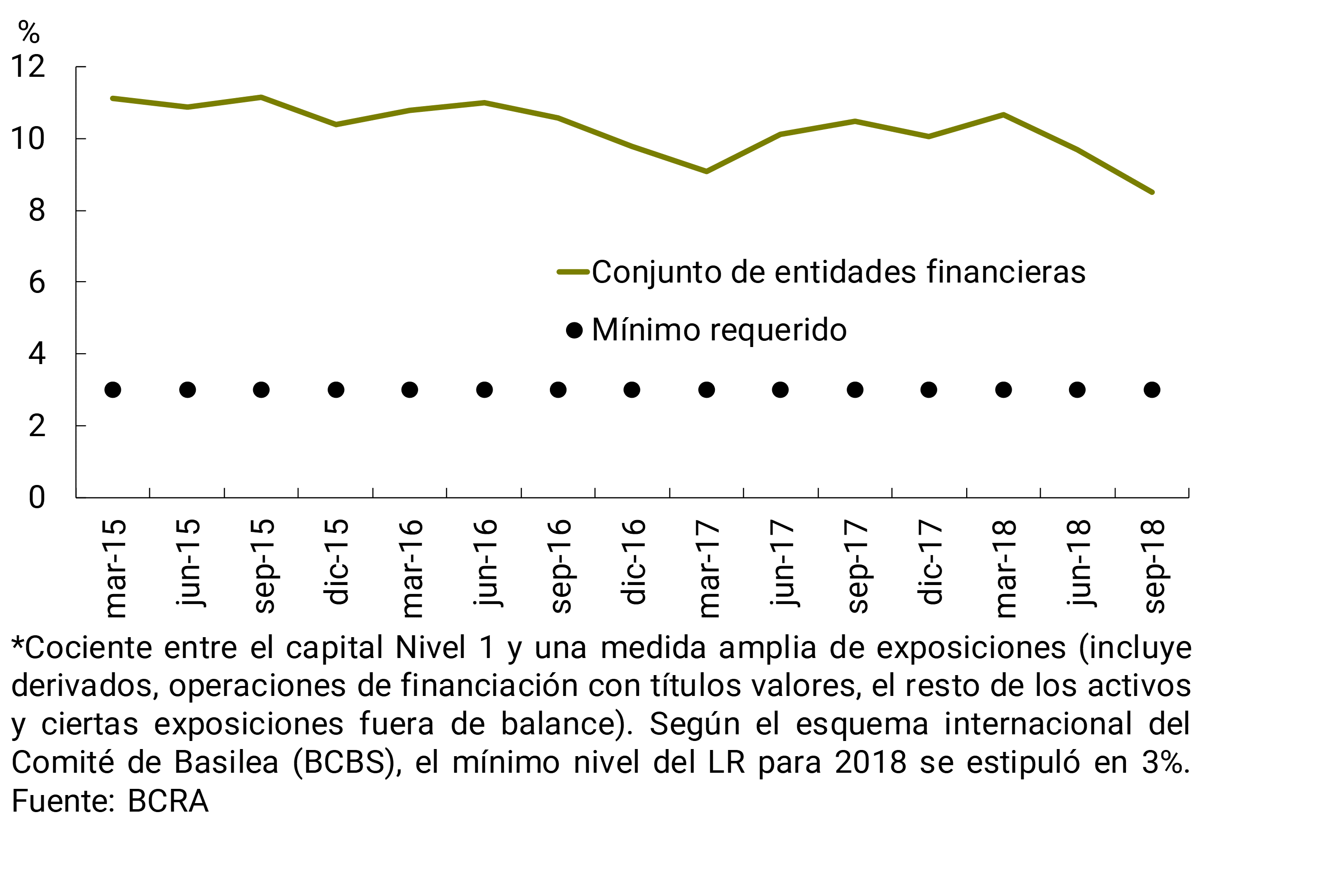 En el cierre del tercer trimestre de 2018 los indicadores de solvencia para el conjunto de bancos mostraron valores relativamente elevados. En septiembre la integración normativa de capital del sistema financiero agregado totalizó 14,4% de los activos ponderados por riesgo (APR), similar al registro del mes pasado (ver Gráfico 17). La mayor parte de tal integración la explicó el capital con más capacidad para absorber pérdidas eventuales (el capital del Nivel 1 representó 88% del total). El excedente de capital representó 67% de la exigencia regulatoria a nivel sistémico.27 El grado de apalancamiento del sector continuó siendo moderado. El coeficiente de apalancamiento para el conjunto de bancos locales alcanzó 8,5% a septiembre, siendo muy superior a la cota regulatoria inferior de 3% (recomendada por el Comité de Basilea, ver Gráfico 18). Cabe considerar que, desde estos niveles elevados, los ratios de integración de capital y de apalancamiento se redujeron en una comparación interanual.