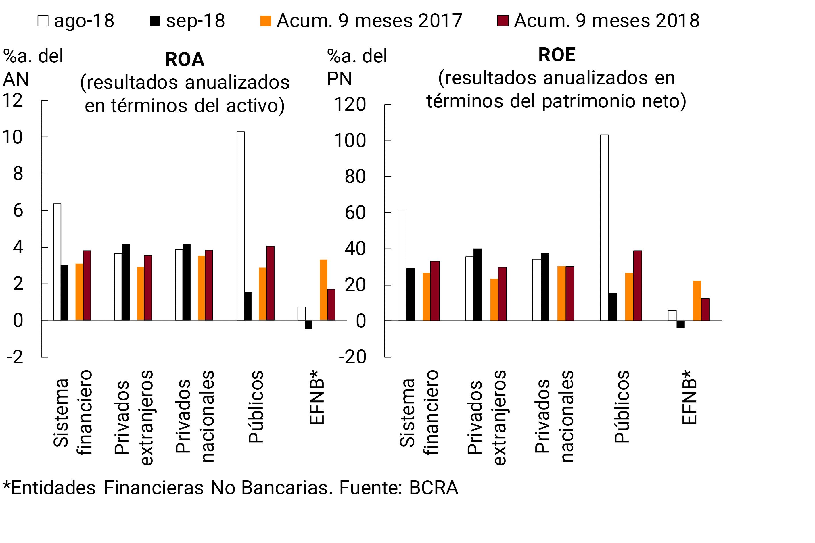 Teniendo en cuenta el grupo de bancos privados, en septiembre el margen financiero aumentó 0,6 p.p. del activo con respecto a agosto. Tal incremento se debió a la reversión de las pérdidas evidenciadas en el mes pasado por diferencias de cotización y al aumento de las ganancias por títulos valores, efectos compensados parcialmente por menores beneficios por operaciones a término de moneda extranjera, aumento de egresos por intereses y reducción de ingresos por intereses. En el acumulado de nueve meses del año, el margen financiero de los bancos privados representó 11,7%a. del activo, 0,4 p.p. más que en el mismo período de 2017.