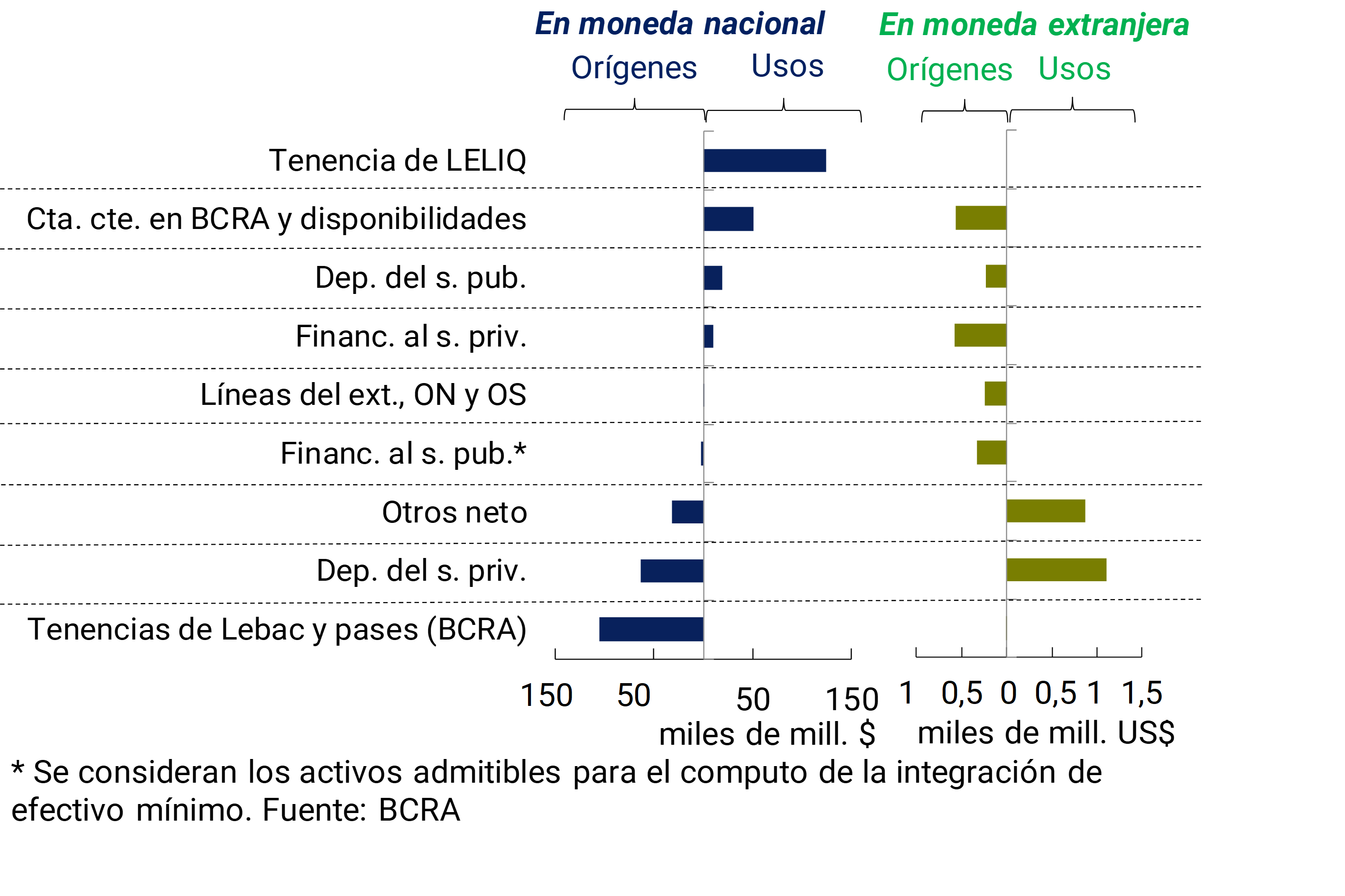 Para analizar las principales características de la operatoria mensual del sistema financiero, se presenta una estimación del flujo de fondos para las partidas en moneda nacional del sector.8 En septiembre los principales orígenes de recursos provinieron de la disminución de las tenencias de LEBAC ($106.000 millones) y el aumento de los depósitos del sector privado ($64.000 millones) (ver Gráfico 2). Estos fondos se destinaron principalmente a incrementar el saldo de LELIQ ($124.000 millones) y de las cuentas corrientes en el BCRA ($51.000 millones). Por su parte, la hoja de balance en moneda extranjera de los bancos se redujo levemente en el mes. La merma en el crédito al sector privado y en la liquidez en esta denominación resultaron los orígenes de fondos más relevantes en septiembre. Mientras que la principal aplicación de esos recursos fue la disminución de los depósitos del sector privado.