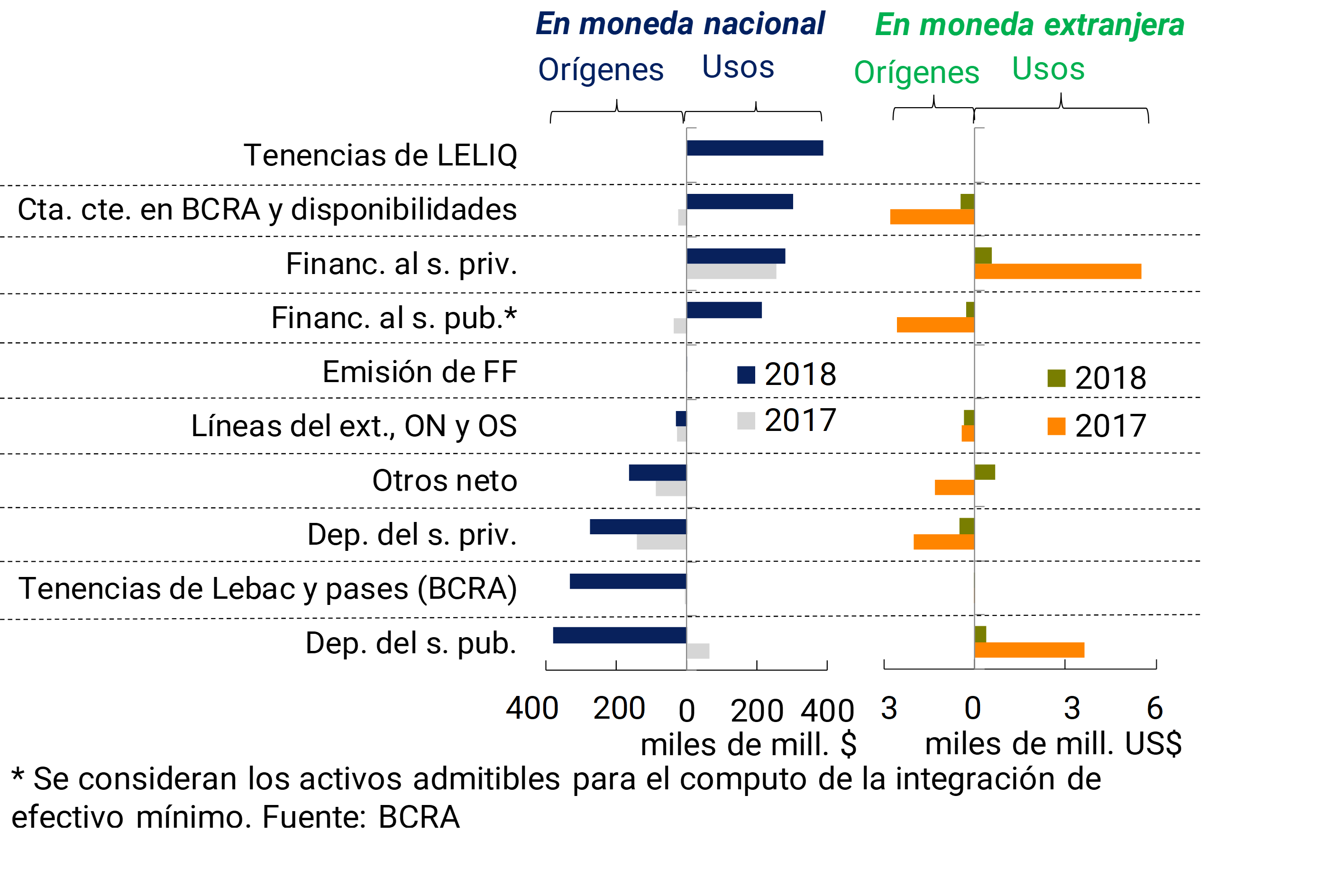 En los primeros 9 meses del año, considerando las partidas en moneda nacional, el sistema financiero agregado se fondeó principalmente con el incremento de los depósitos del sector público ($379.000 millones), la reducción de las tenencias de LEBAC y pases con el BCRA ($331.000 millones) y el aumento de los depósitos del sector privado ($276.000 millones) (ver Gráfico 3).9 Estos recursos se canalizaron mayormente a aumentar las tenencias de LELIQ ($389.000 millones), las cuentas corrientes que las entidades poseen en el BCRA ($302.000 millones) y al financiamiento al sector privado ($280.000 millones). Considerando los movimientos de los principales rubros del balance en moneda extranjera, en lo que va de 2018, se evidenció un menor volumen de operaciones respecto al mismo período del año anterior. El aumento de los depósitos del sector privado conjuntamente con una reducción de la liquidez fueron los orígenes de fondos en moneda extranjera más relevante para los bancos. En tanto que el aumento del financiamiento al sector privado y la disminución de los depósitos del sector público fueron las principales aplicaciones de recursos en el período para las partidas en este segmento.