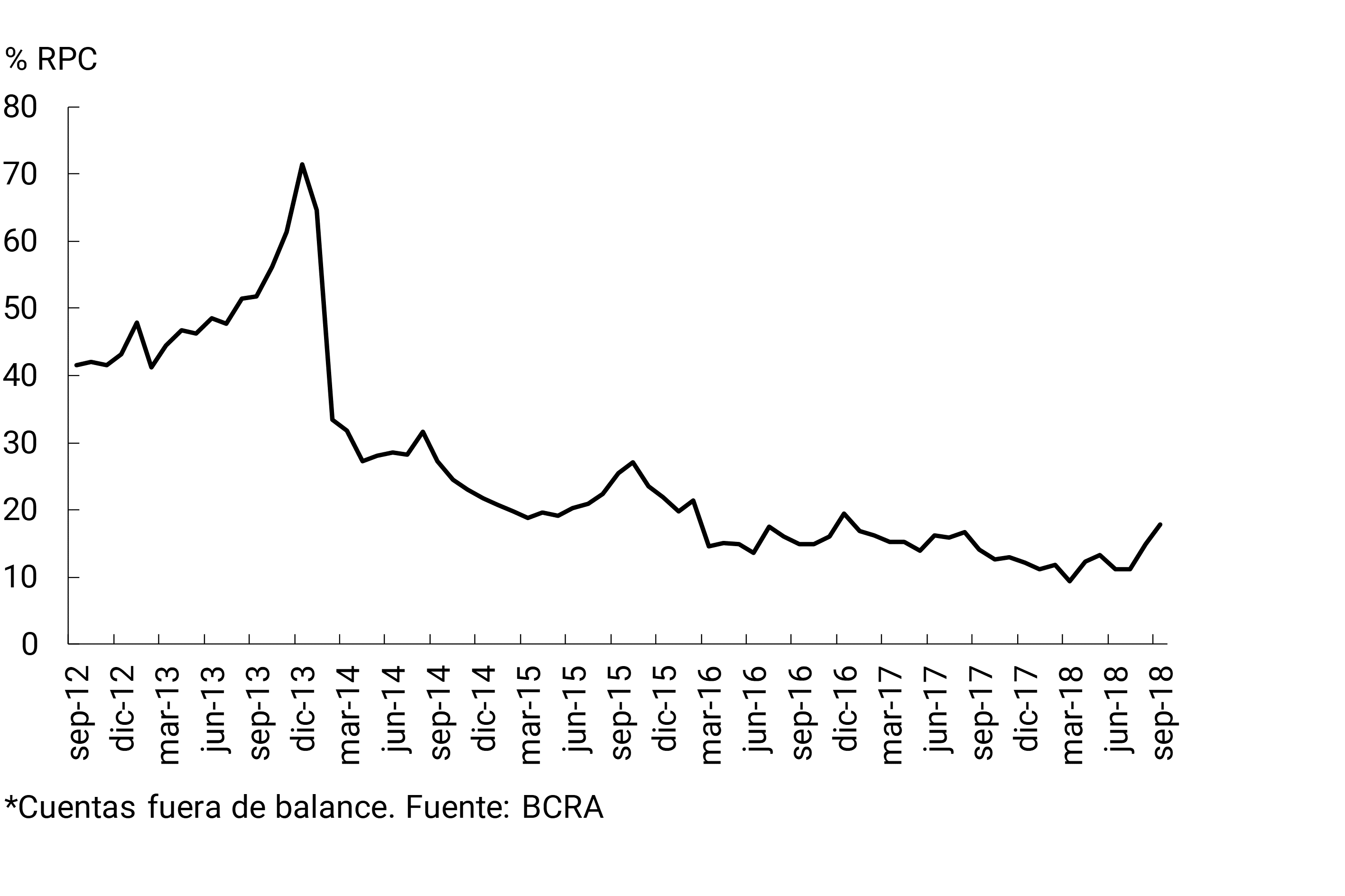 En septiembre el descalce activo de moneda extranjera —medido en pesos— creció 2,9 p.p. de la RPC —Responsabilidad Patrimonial Computable— hasta totalizar 17,8%.10 El aumento mensual estuvo explicado fundamentalmente por las mayores compras netas a término de moneda extranjera. Cabe considerar que este descalce se ubica en niveles relativamente bajos en comparación los picos evidenciados en los años anteriores (ver Gráfico 4), fundamentalmente como resultado de la normativa macroprudencial del BCRA. Por su parte, el descalce activo de partidas ajustables por CER se redujo levemente en el mes —los depósitos en UVA crecieron 27,5% y el crédito en esta denominación tuvo un desempeño moderado—, ubicándose así en torno a 48,7% del capital regulatorio. En los últimos 6 meses este descalce se incrementó principalmente por la reexpresión de los capitales en el marco del aumento de la inflación evidenciada en el período.11