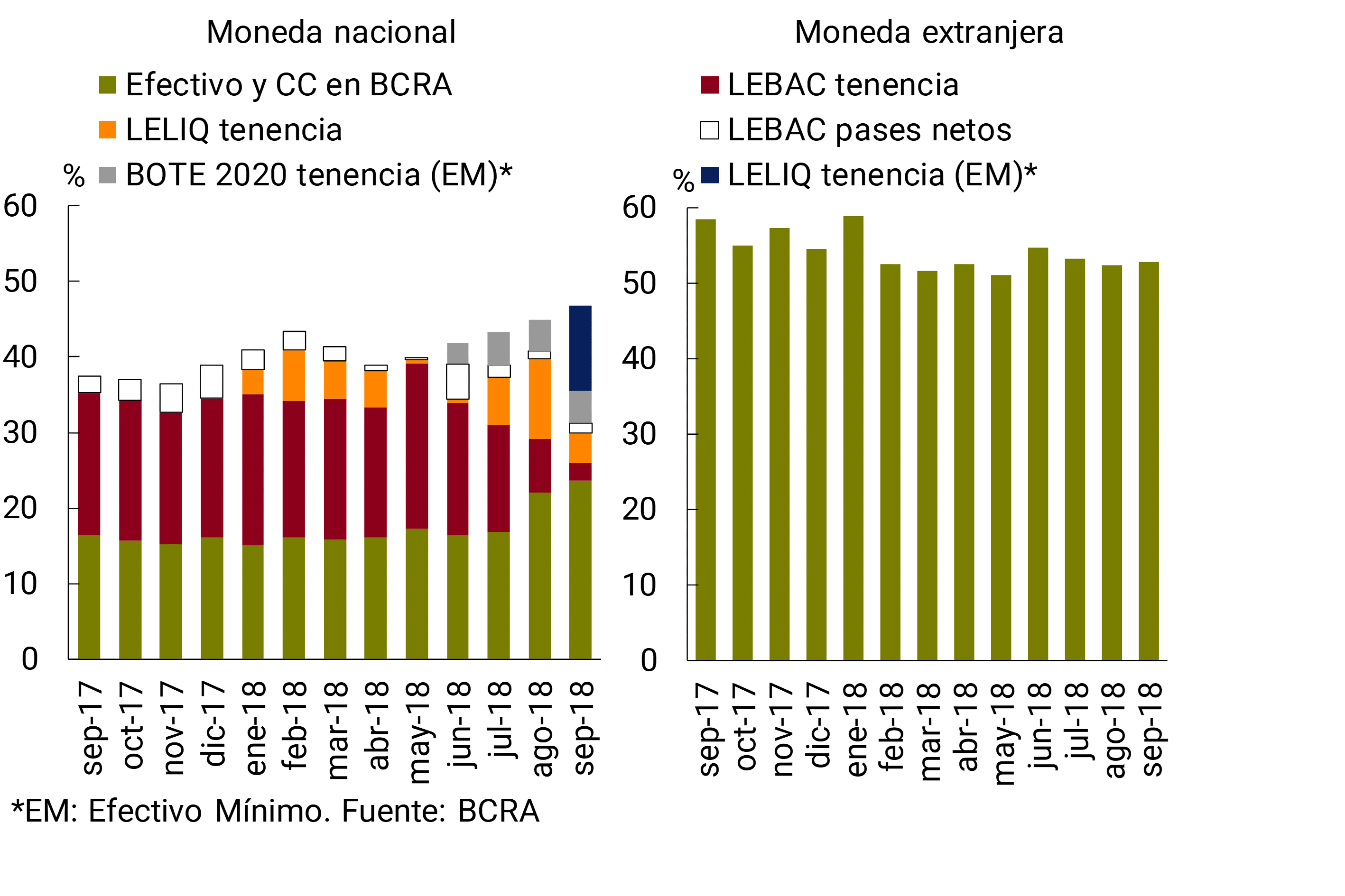 Comunicación A6569 – 14/09/18 | Con vigencia a partir del 19/9/18 se incrementan en 5% las tasas de exigencia de efectivo mínimo en pesos para las entidades financieras con una participación de al menos 1% en el total de depósitos del sector privado no financiero del sistema. El incremento de dicha exigencia sobre las colocaciones a plazo de hasta 59 días de plazo residual (excluidas las expresadas en UVA y UVI) podrá integrarse en pesos, LELIQ y NOBAC. El aumento en la exigencia (del período y diaria) sobre las demás partidas sujetas a encaje deberá ser integrado en pesos.