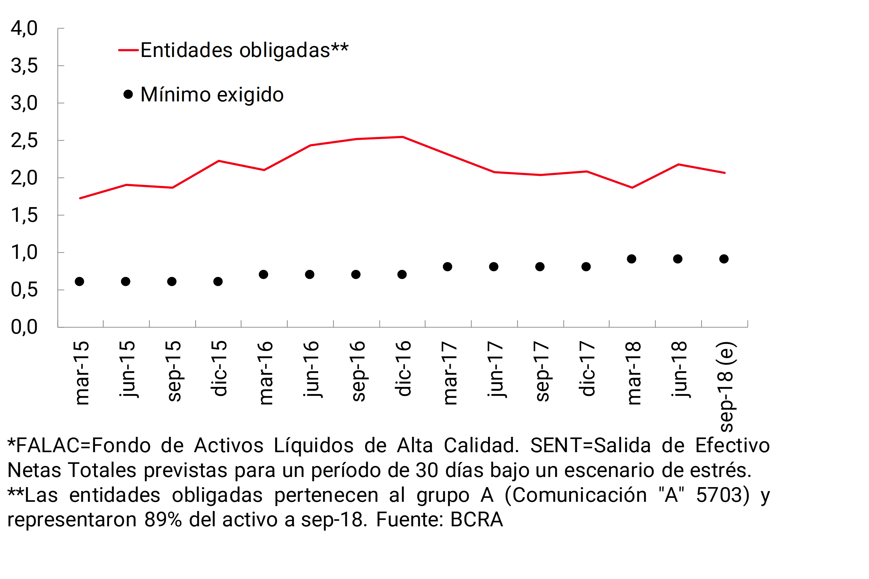 El Ratio de Cobertura de Liquidez (LCR, por sus siglas en inglés) del sistema financiero local continuó en niveles elevados.15 Se estima que al cierre del tercer trimestre de 2018 el LCR, que mide la disponibilidad de fondos de calidad en un escenario hipotético de estrés, continuó superando ampliamente el mínimo local exigido (ver Gráfico 9).16 Adicionalmente, el Ratio de Fondeo Neto Estable (NFSR, por sus siglas en inglés), que mide la disponibilidad de recursos de los bancos lo suficientemente estables con los cuales fondear activos de plazos más largo, se ubicó en torno a 1,5 a mediados de año, superando así en casi 50% el mínimo local exigido (alineado con los estándares recomendados internacionalmente).