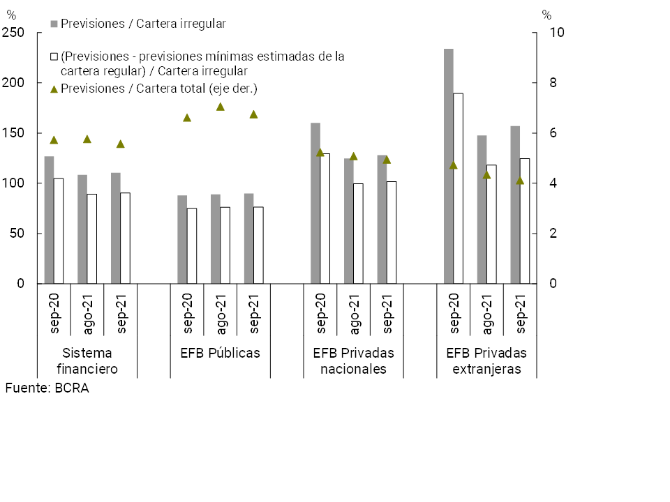 Hacia el cierre del tercer trimestre, las previsiones totales del sistema financiero agregado representaron 5,6% del crédito total al sector privado, 0,2 p.p. inferior al nivel tanto del mes pasado como de septiembre de 2020 (ver Gráfico 11). Las previsiones totales en términos de la cartera irregular se ubicaron en 110,5% en el mes a nivel sistémico, 2,2 p.p. más que el mes anterior (-16,3 p.p. i.a.). Se estima que en septiembre el saldo de previsiones regulatorias atribuibles a la cartera irregular (siguiendo los criterios de las normas de previsiones mínimas regulatorias por riesgo de incobrabilidad) representó 90,4% de dicha cartera para el agregado de entidades.
