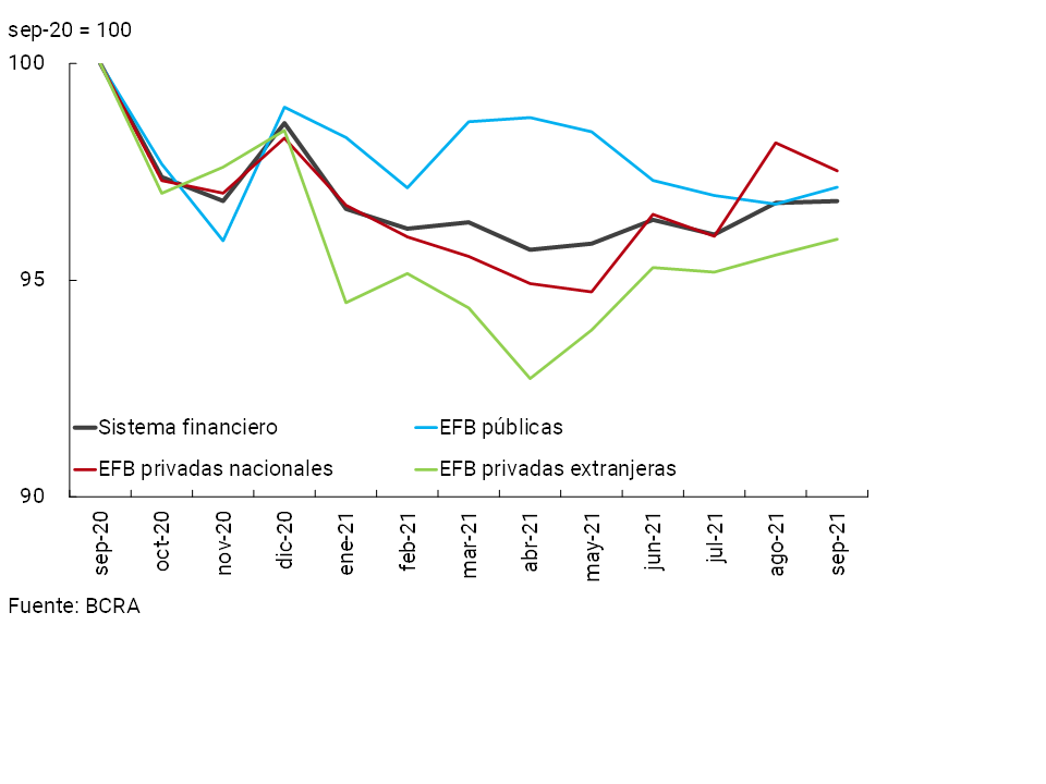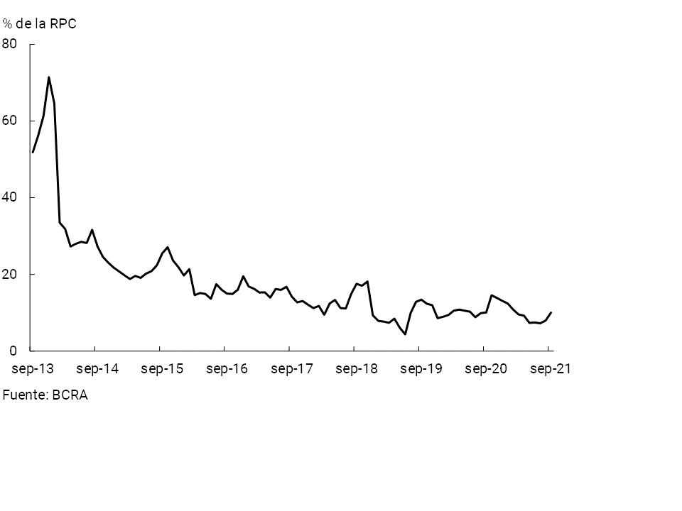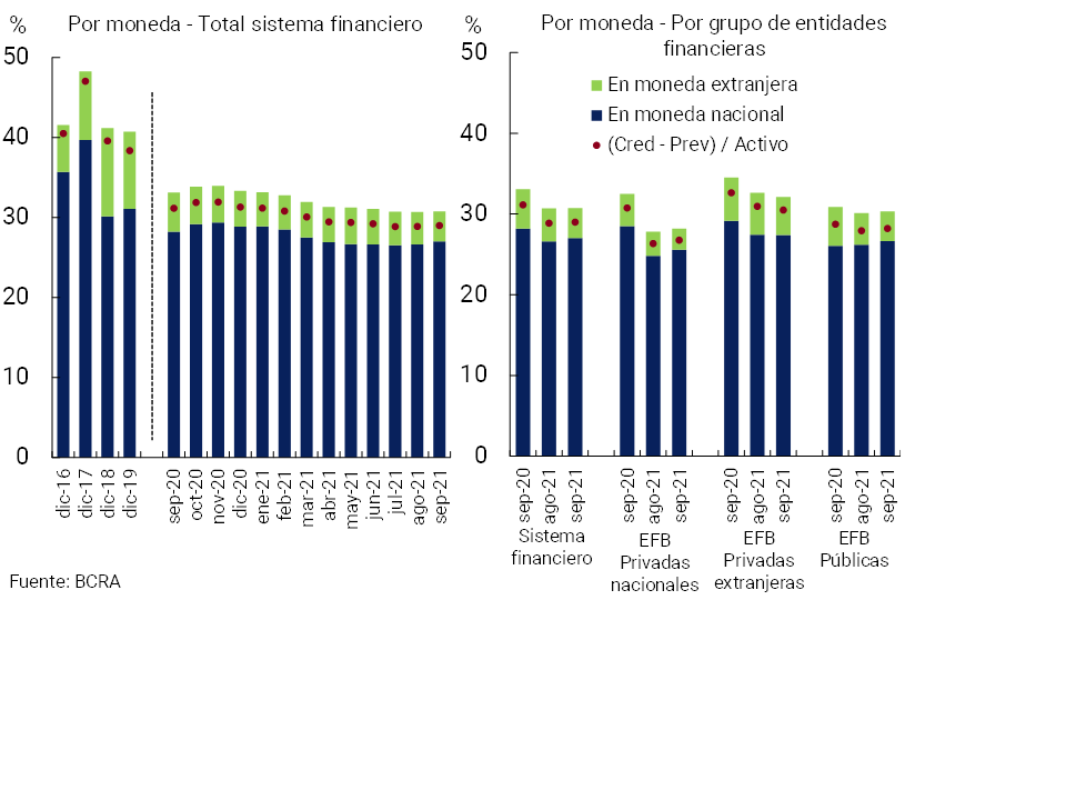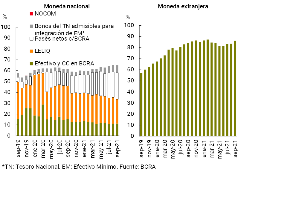• La liquidez amplia del sistema financiero se ubicó en 68,8% de los depósitos totales a nivel agregado en el mes (65% para las partidas en pesos y 86,3% para el segmento en moneda extranjera), 0,2 p.p. y 2,8 p.p. más que el registro de agosto y que el evidenciado en septiembre de 2020, respectivamente.