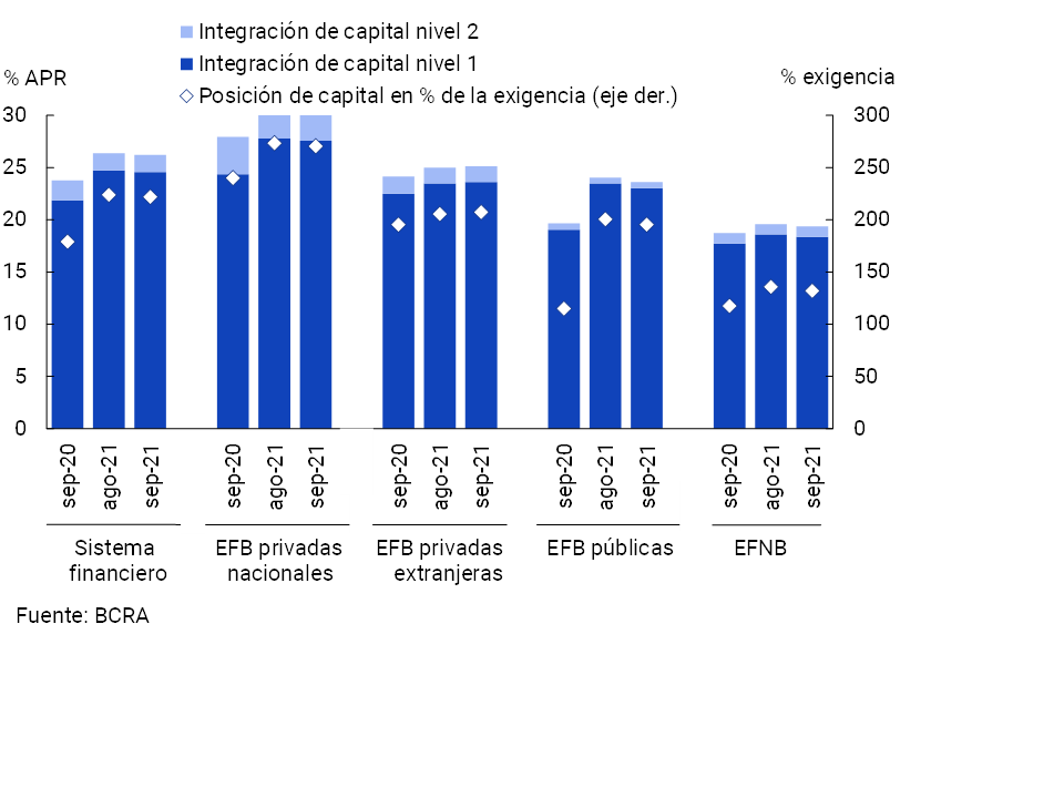 • Desde niveles elevados, en septiembre se redujeron levemente los ratios agregados de capital regulatorio. La integración de capital regulatorio (RPC) en términos de los activos ponderados por riesgo (APR) se ubicó en 26,2% a nivel sistémico en septiembre, 0,2 p.p. menos que el mes pasado (+2,4 p.p. i.a.). La posición de capital (integración menos exigencia normativa) del sistema financiero totalizó 222% de la exigencia regulatoria en el período, 2 p.p. por debajo del nivel de agosto (+42,9 p.p. i.a.).