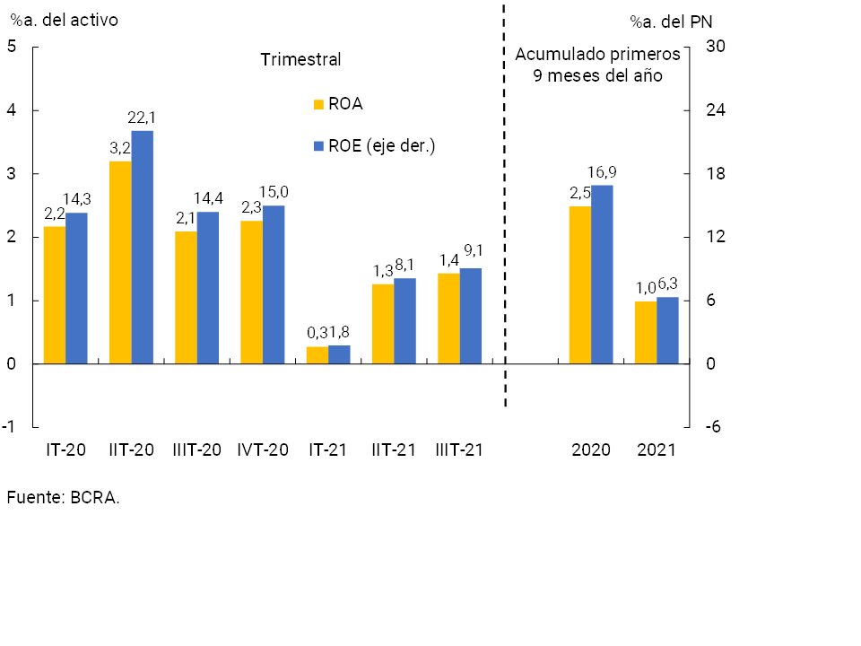 En el acumulado de los primeros 9 meses del año el sector devengó un ROA de 1%a. y un ROE de 6,3%a., 1,5 p.p. y 10,6 p.p. por debajo de los registrados en igual período de 2020. Los principales factores que explicaron el desempeño estuvieron asociados a mayores pérdidas por ajustes monetarios (vinculados a la evolución del índice de precios), aumento en el costo de fondeo por depósitos en pesos, menores ingresos por intereses en pesos y una mayor relevancia de las cargas impositivas. Estos efectos fueron parcialmente compensados por mayores ingresos, tanto por primas por pases como por títulos valores, así como por un menor devengamiento del impuesto a las ganancias y reducción en los cargos por incobrabilidad, entre otros.