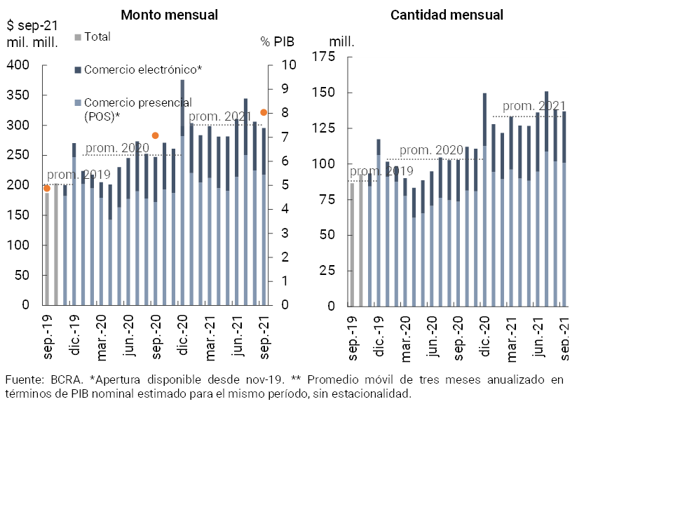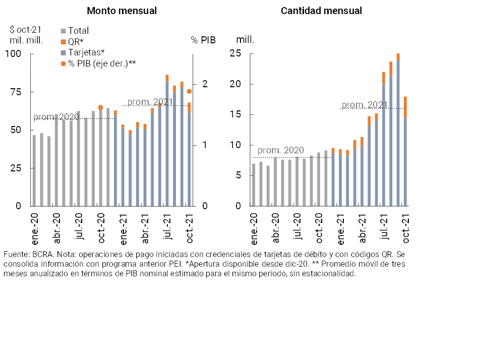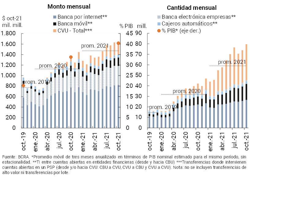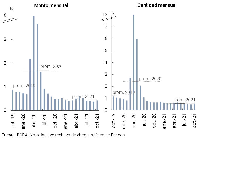 • En los últimos meses las operaciones de pago por canales electrónicos continuaron presentando un positivo desempeño. El volumen de las transferencias inmediatas acumuló un crecimiento de 19,2% i.a. real (89% i.a. en cantidad) a octubre. A su vez, el valor compensado mediante cheques electrónicos (ECHEQs) se expandió 92,2% i.a. real (131% i.a. en cantidad), aumentando su relevancia en el total de cheques compensados hasta totalizar 46% y 21% del valor y la cantidad total en octubre, respectivamente.