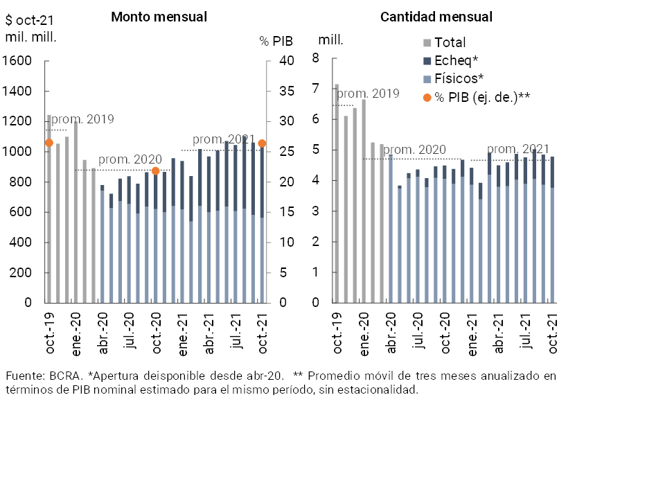 En octubre se redujo la compensación de cheques respecto al mes anterior, presentado un comportamiento dispar según tipo de cheque: menores operaciones (y valores cursados) en el formato físico y crecimiento en cantidades en la versión electrónica (sin cambios de magnitud en cuanto al monto negociado). De esta manera, en octubre los ECHEQs continuaron incrementando su ponderación en la compensación total hasta representar 21,3% en cantidades (+11,5p.p. i.a.) y 45,8% en montos reales (+17,3p.p. i.a., ver Gráfico 18). Recogiendo el destacado aporte que los ECHEQs tuvieron en el último año (+131% i.a. en cantidades y +92,2% real en montos), la compensación total de cheques aumentó respecto al mismo período de 2020 (+6,5% en cantidades y 19,6% real en montos). Se estima que el monto de cheques compensados en términos del PIB totalizó 26,4% a octubre (+ 4,6 p.p. i.a.).