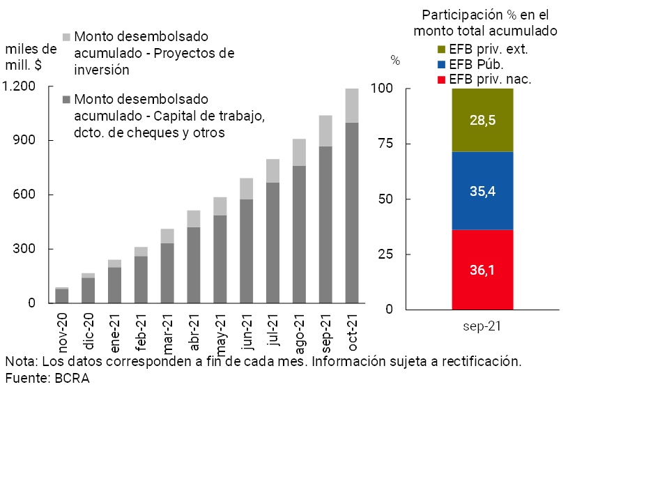 Paralelamente, mediante la línea de financiamiento a tasas de interés subsidiadas para empresas inscriptas en el “Programa de Asistencia de Emergencia al Trabajo y la Producción” (ATP)5, hasta octubre se llevan otorgados cerca de 20.900 créditos por más de $14.300 millones.